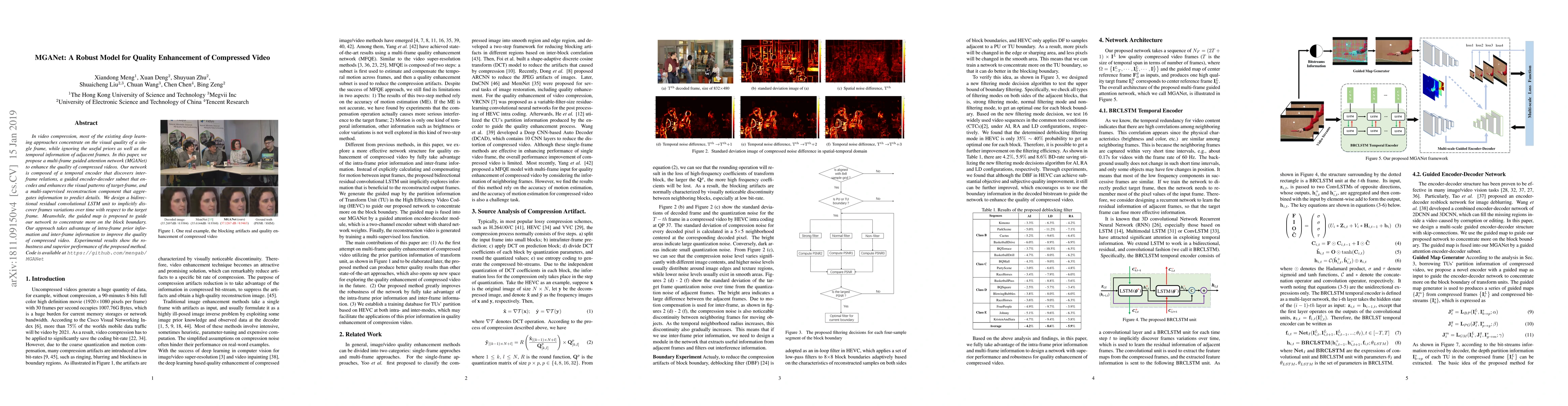 The MGANet model enhances the quality of compressed videos by leveraging both intra-frame and inter-frame information through a multi-frame guided attention network, incorporating temporal encoders and a bidirectional residual convolutional LSTM unit for improved temporal relations. Experimental results demonstrate its superior performance and robustness.