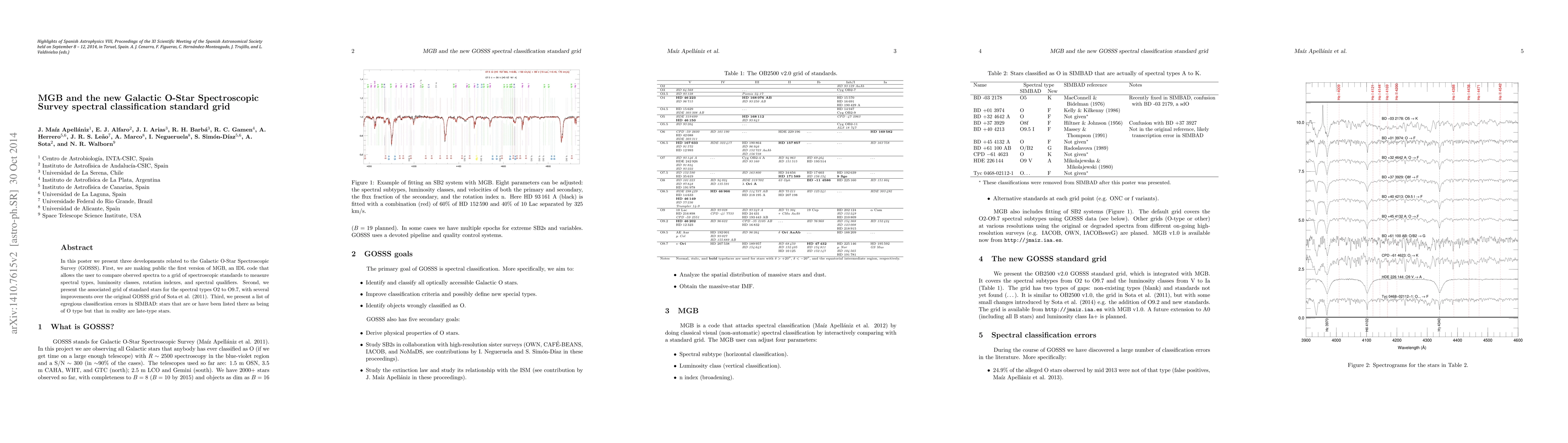 In this poster we present three developments related to the Galactic O-Star Spectroscopic Survey (GOSSS). First, we are making public the first version of MGB, an IDL code that allows the user to compare oberved spectra to a grid of spectroscopic standards to measure spectral types, luminosity classes, rotation indexes, and spectral qualifiers. Second, we present the associated grid of standard stars for the spectral types O2 to O9.7, with several improvements over the original GOSSS grid of Sota et al. (2011). Third, we present a list of egregious classification errors in SIMBAD: stars that are or have been listed there as being of O type but that in reality are late-type stars.