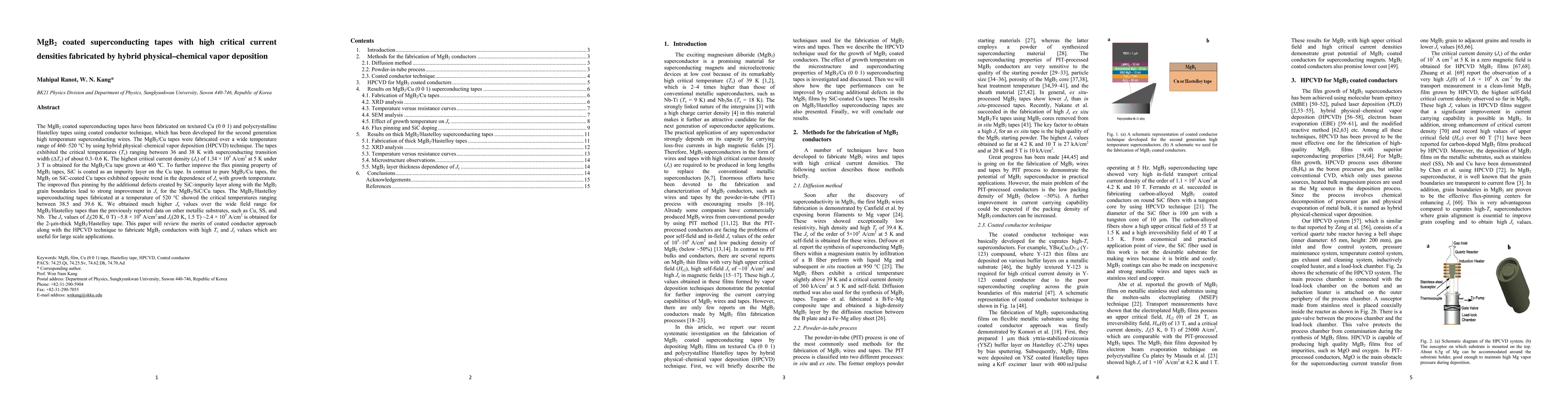 This paper details the fabrication of high-temperature superconducting MgB2 tapes using hybrid physical-chemical vapor deposition (HPCVD) on textured Cu and polycrystalline Hastelloy substrates, achieving critical current densities (Jc) up to 1.34 × 10^5 A/cm² at 5 K under 3 T. The addition of a SiC impurity layer further enhances flux pinning, significantly improving Jc values for MgB2/SiC/Cu tapes.