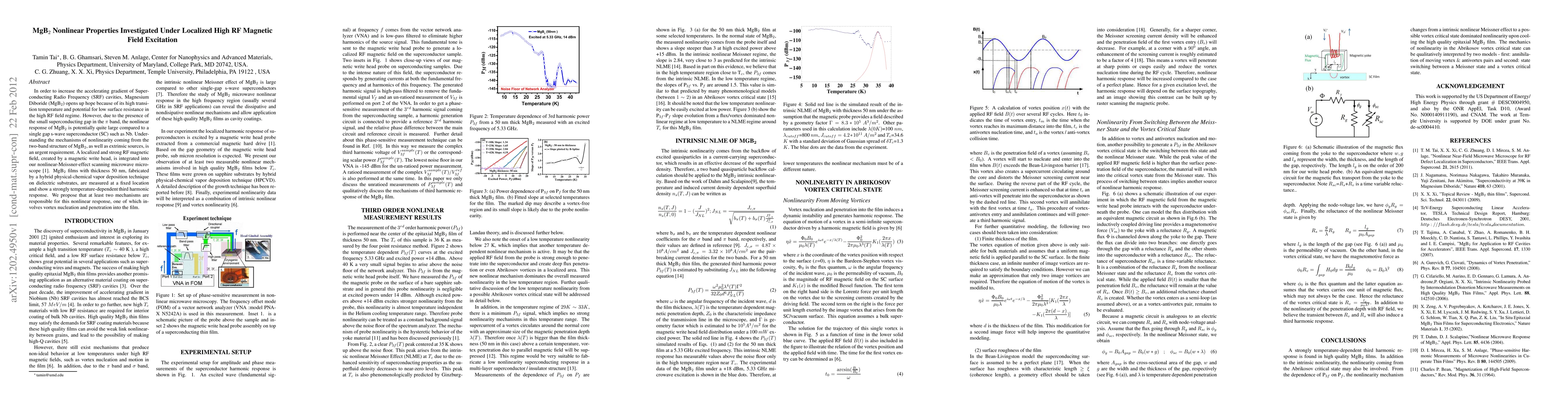 In order to increase the accelerating gradient of Superconducting Radio Frequency (SRF) cavities, Magnesium Diboride (MgB2) opens up hope because of its high transition temperature and potential for low surface resistance in the high RF field regime. However, due to the presence of the small superconducting gap in the {\pi} band, the nonlinear response of MgB2 is potentially quite large compared to a single gap s-wave superconductor (SC) such as Nb. Understanding the mechanisms of nonlinearity coming from the two-band structure of MgB2, as well as extrinsic sources, is an urgent requirement. A localized and strong RF magnetic field, created by a magnetic write head, is integrated into our nonlinear-Meissner-effect scanning microwave microscope [1]. MgB2 films with thickness 50 nm, fabricated by a hybrid physical-chemical vapor deposition technique on dielectric substrates, are measured at a fixed location and show a strongly temperature-dependent third harmonic response. We propose that at least two mechanisms are responsible for this nonlinear response, one of which involves vortex nucleation and penetration into the film. [1] T. M. Tai, X. X. Xi, C. G. Zhuang, D. I. Mircea, S. M. Anlage, "Nonlinear Near-Field Microwave Microscope for RF Defect Localization in Superconductors", IEEE Trans. Appl. Supercond. 21, 2615 (2011).