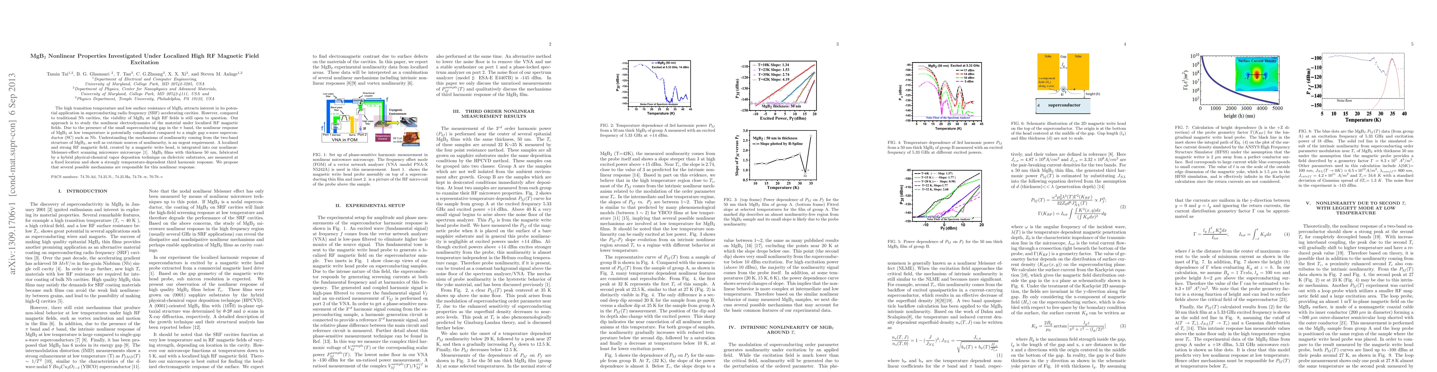 The high transition temperature and low surface resistance of MgB2 attracts interest in its potential application in superconducting radio frequency accelerating cavities. However, compared to traditional Nb cavities, the viability of MgB2 at high rf fields is still open to question. Our approach is to study the nonlinear electrodynamics of the material under localized rf magnetic fields. Because of the presence of the small superconducting gap in the $\pi$ band, the nonlinear response of MgB2 at low temperature is potentially complicated compared to a single-gap s-wave superconductor such as Nb. Understanding the mechanisms of nonlinearity coming from the two-band structure of MgB2, as well as extrinsic sources of nonlinearity, is an urgent requirement. A localized and strong rf magnetic field, created by a magnetic write head, is integrated into our nonlinear-Meissner-effect scanning microwave microscope [Tamin Tai, X. X. Xi, C. G. Zhuang, D. I. Mircea, and S. M. Anlage, IEEE Trans. Appl. Supercond. 21, 2615 (2011)]. MgB2 films with thickness 50 nm, fabricated by a hybrid physical-chemical vapor deposition technique on dielectric substrates, are measured at a fixed location and show a strongly temperature-dependent third harmonic response. We propose that several possible mechanisms are responsible for this nonlinear response.