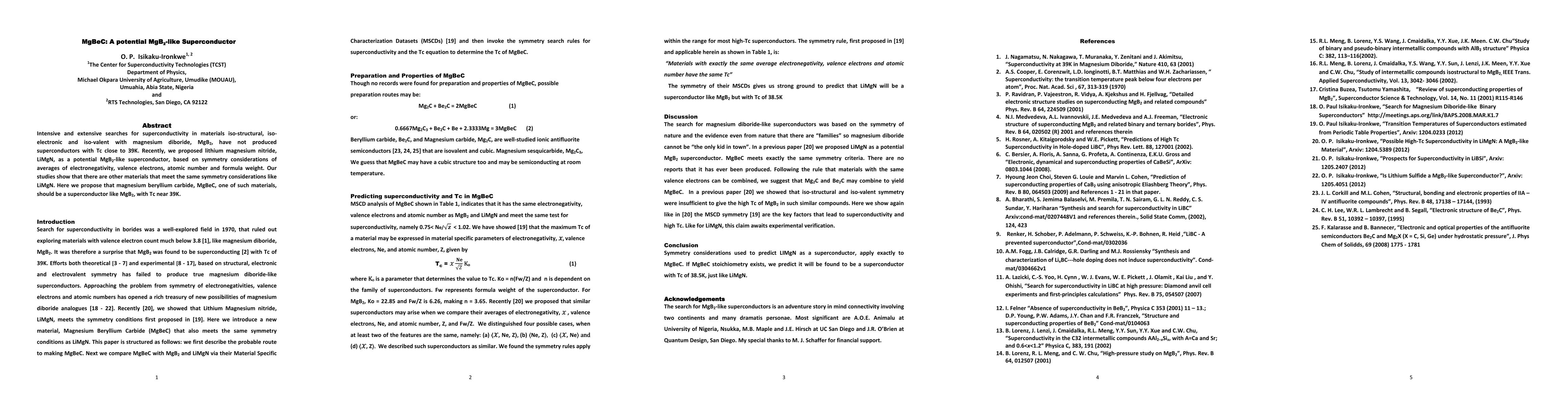 Intensive and extensive searches for superconductivity in materials iso-structural, iso-electronic and iso-valent with magnesium diboride, MgB2, have not produced superconductors with Tc close to 39K. Recently, we proposed lithium magnesium nitride, LiMgN, as a potential MgB2-like superconductor, based on symmetry considerations of averages of electronegativity, valence electrons, atomic number and formula weight. Our studies show that there are other materials that meet the same symmetry considerations like LiMgN. Here we propose that magnesium beryllium carbide, MgBeC, one of such materials, should be a superconductor like MgB2, with Tc near 39K.