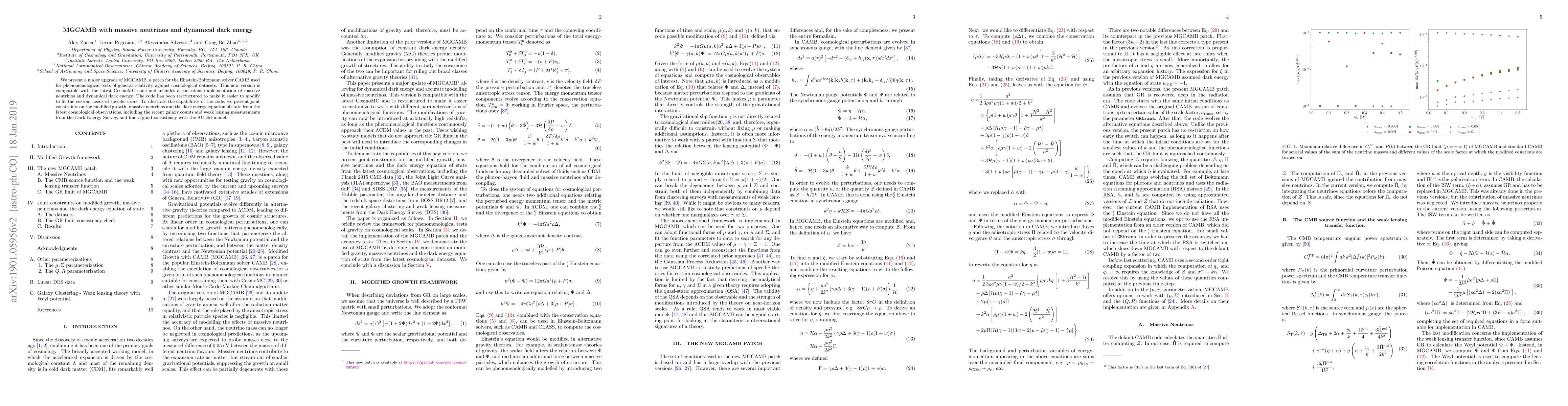 We present a major upgrade of MGCAMB, a patch for the Einstein-Boltzmann solver CAMB used for phenomenological tests of general relativity against cosmological datasets. This new version is compatible with the latest CosmoMC code and includes a consistent implementation of massive neutrinos and dynamical dark energy. The code has been restructured to make it easier to modify to fit the custom needs of specific users. To illustrate the capabilities of the code, we present joint constraints on the modified growth, massive neutrinos and the dark energy equation of state from the latest cosmological observations, including the recent galaxy counts and weak lensing measurements from the Dark Energy Survey, and find a good consistency with the {\Lambda}CDM model.