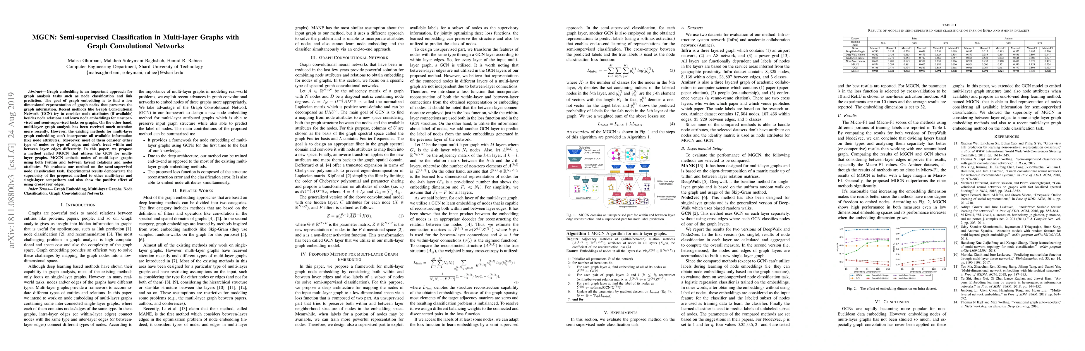 The paper proposes MGCN, a method that leverages Graph Convolutional Networks (GCN) for embedding nodes in multi-layer graphs, incorporating both within and between layer relations and node attributes. Experimental results show MGCN outperforms other methods in semi-supervised node classification, highlighting the benefits of considering cross-layer edges.