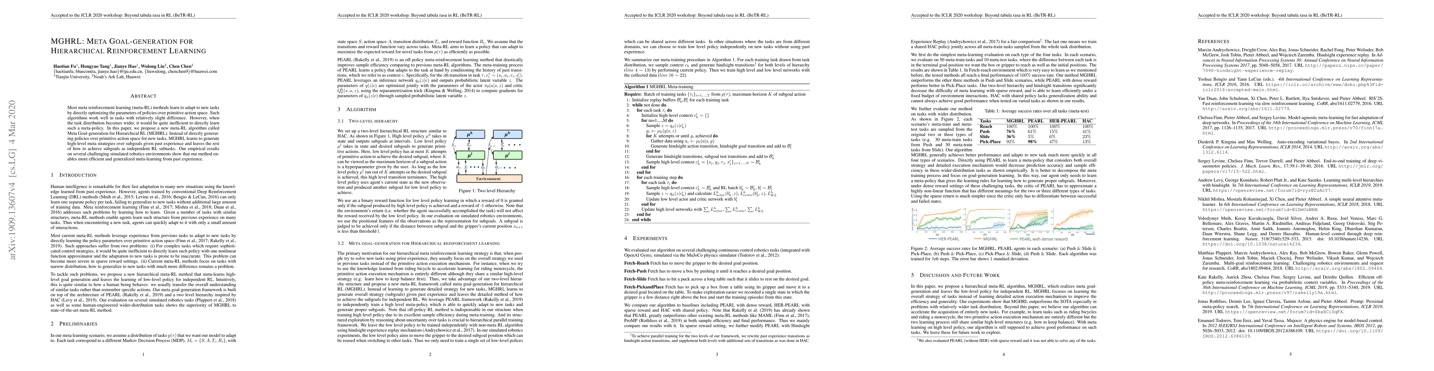 Title: MGHRL: Meta Goal-generation for Hierarchical Reinforcement Learning Summary: This paper introduces MGHRL, a meta-RL algorithm that generates high-level meta strategies based on subgoals to achieve more efficient and generalized learning across a wider task distribution, compared to traditional methods that optimize primitive action policies directly.