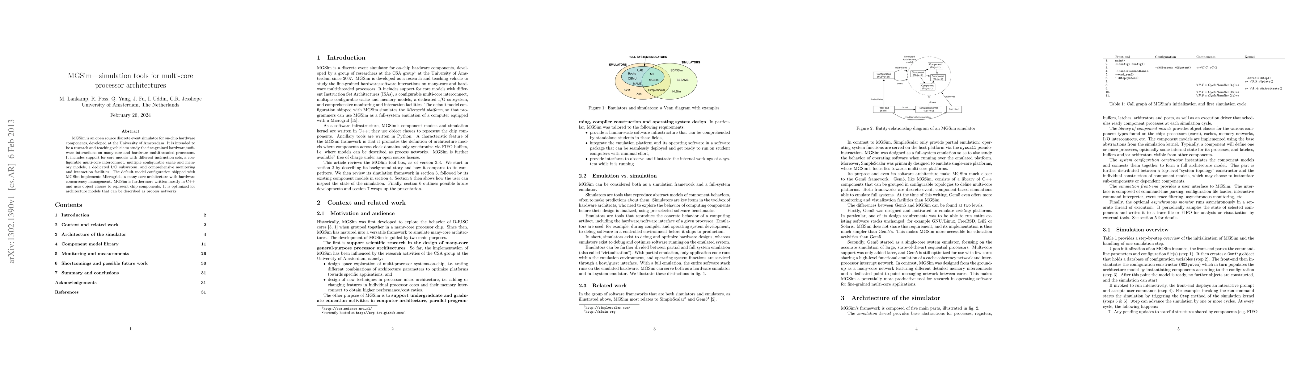 MGSim is an open-source discrete event simulator for studying multi-core processor architectures, developed to facilitate research and teaching on hardware/software interactions. It offers extensive configurability for core models, interconnects, caches, and memory, and is optimized for process network architectures.