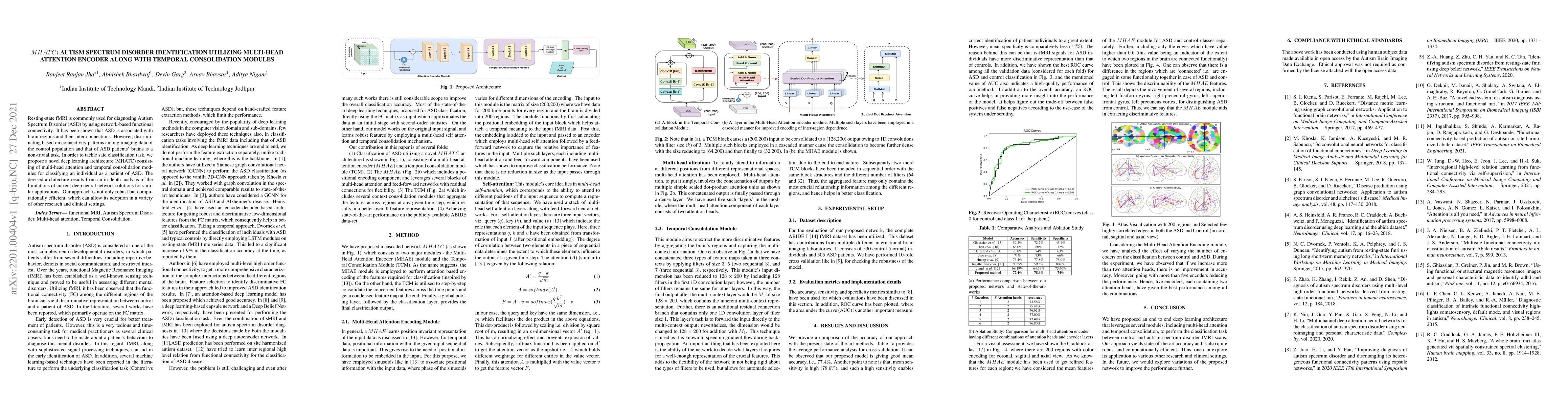 Summary: This paper proposes MHATC, a novel deep learning architecture using multi-head attention and temporal consolidation modules to classify Autism Spectrum Disorder (ASD) from resting-state fMRI data. The approach aims to address the challenges in distinguishing ASD patients from controls based on brain connectivity patterns, demonstrating robustness and computational efficiency.