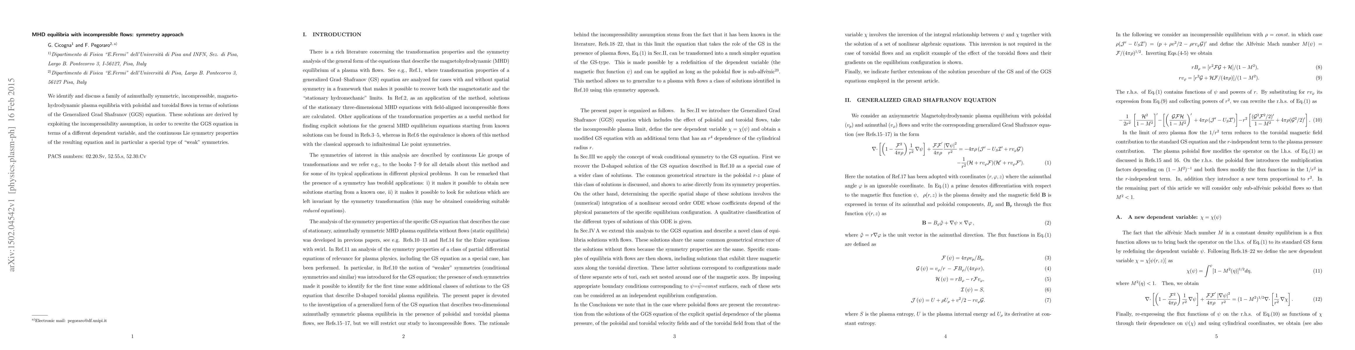 This paper explores azimuthally symmetric, incompressible magnetohydrodynamic plasma equilibria using the Generalized Grad Shafranov equation. It leverages continuous Lie symmetry properties and "weak" symmetries to derive solutions that describe poloidal and toroidal flows.