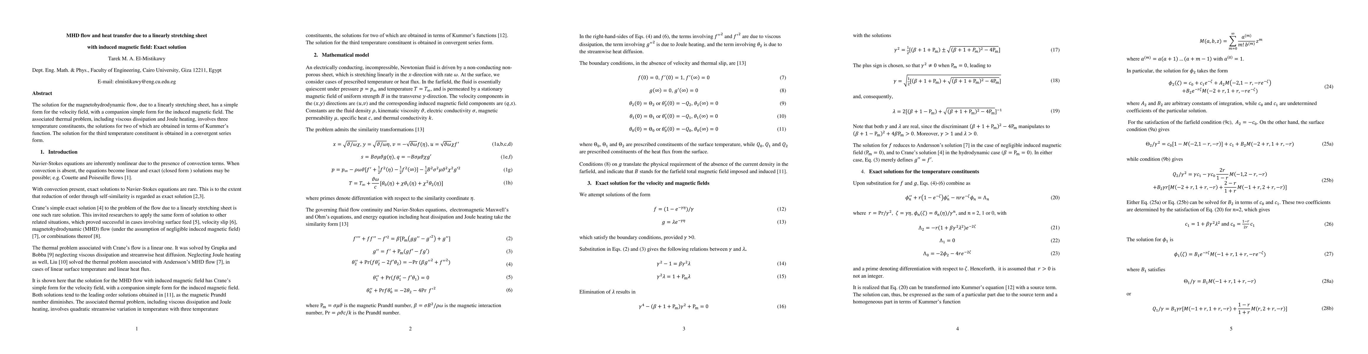 The solution for the MHD flow, due to a linearly stretching sheet, has a simple form for the velocity field, with a companion simple form for the induced magnetic field. The associated thermal problem, including viscous dissipation and Joule heating, involves three temperature constituents, the solutions for two of which are obtained in terms of Kummer's function. The solution for the third temperature constituent is obtained in a convergent series form.