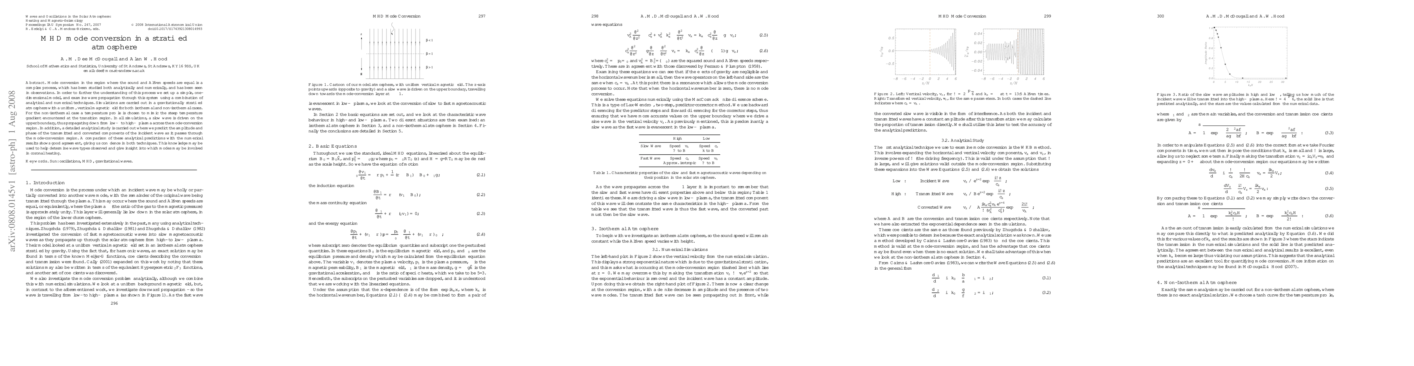 This paper investigates mode conversion in a stratified atmosphere where sound and Alfven speeds are equal, using a one-dimensional model with both analytical and numerical techniques. The study compares isothermal and non-isothermal cases, showing good agreement between analytical predictions and numerical simulations, which may aid in understanding coronal heating mechanisms.