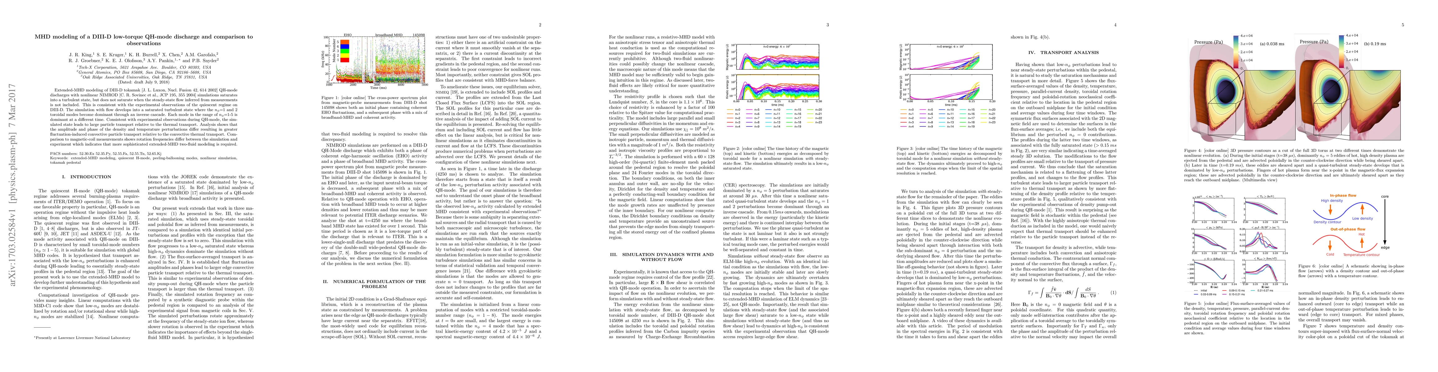 This paper uses extended-MHD modeling to simulate DIII-D tokamak's low-torque QH-mode discharges, showing that simulations without steady-state flow do not saturate, unlike those including it. The model with flow develops into a turbulent state with dominant toroidal modes n=1 and 2, consistent with experimental observations.