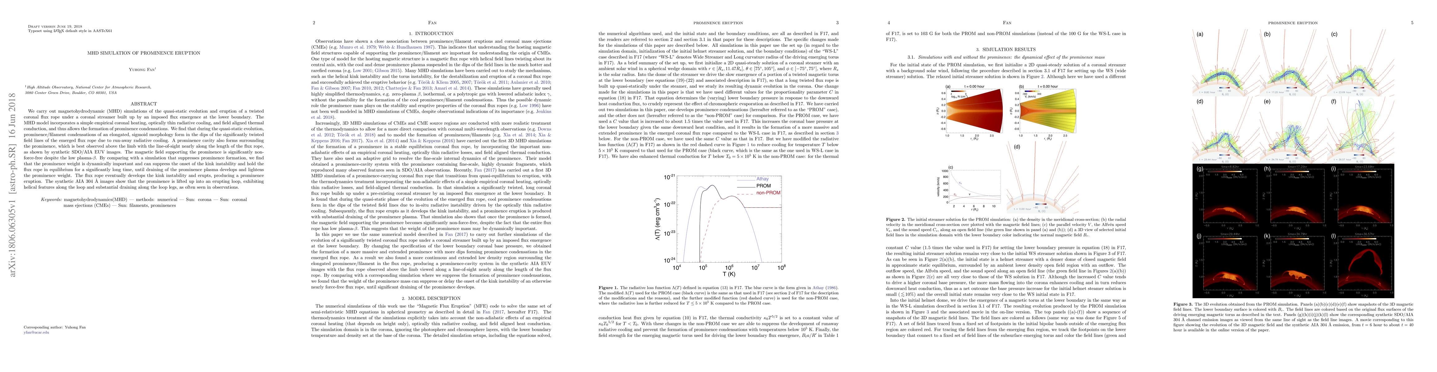 This paper presents MHD simulations of a twisted coronal flux rope's evolution and eruption under a coronal streamer, revealing the formation of elongated, sigmoid prominences due to radiative cooling. The prominence's weight dynamically stabilizes the flux rope, delaying the kink instability until plasma drainage triggers the eruption.