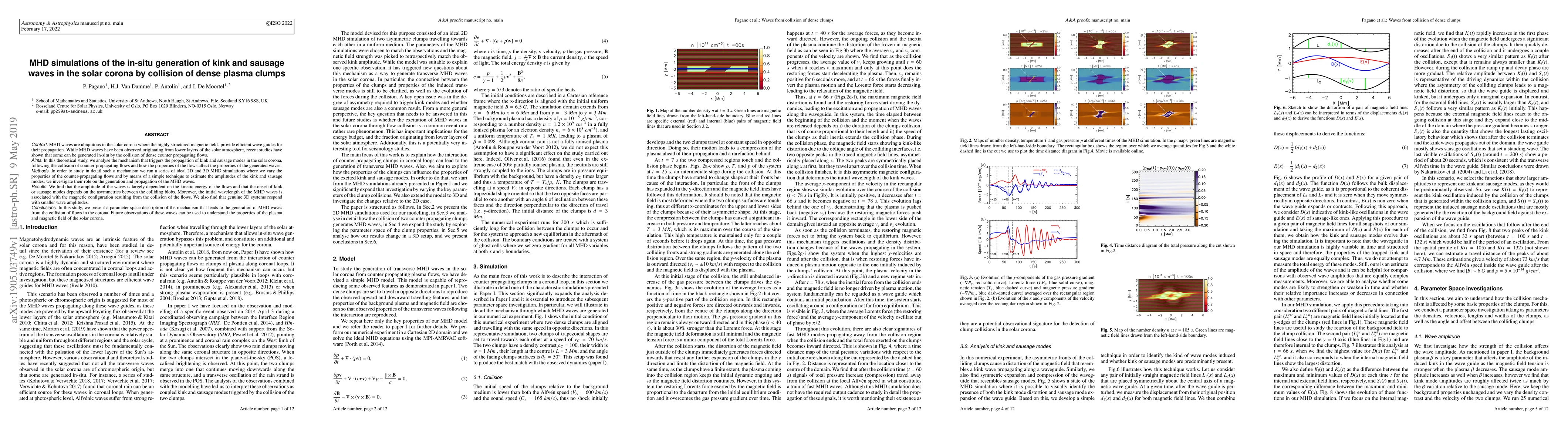 This paper investigates the in-situ generation of kink and sausage modes in the solar corona via the collision of dense counter-propagating plasma flows using 2D and 3D MHD simulations. The study finds that wave amplitudes depend on flow kinetic energy and asymmetries, while initial wavelengths correlate with the resulting magnetic configuration.