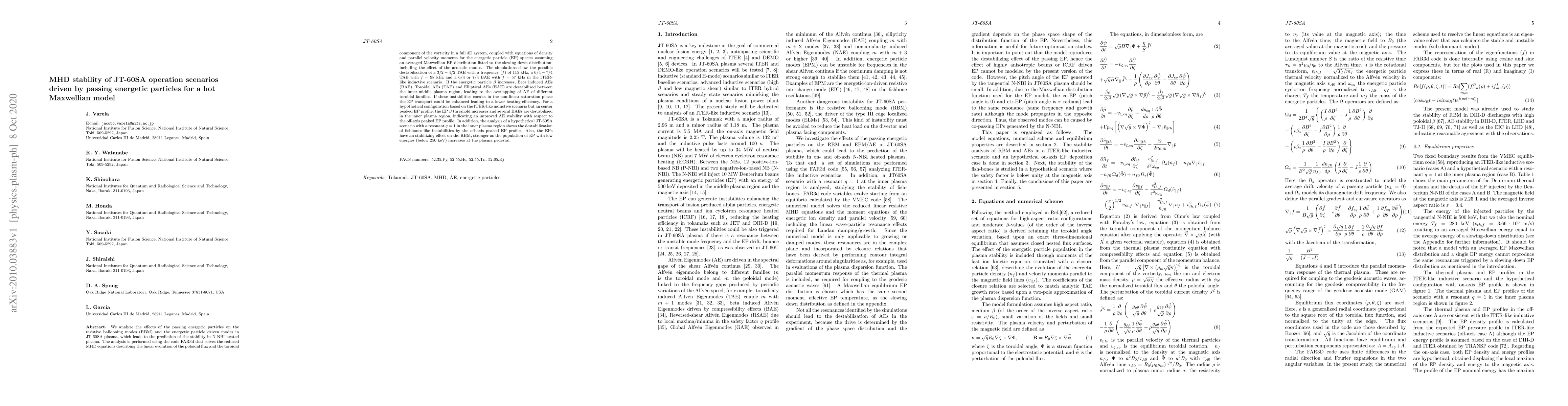 The study examines how passing energetic particles affect MHD stability in JT-60SA plasma, predicting destabilization of certain modes under different heating scenarios.
