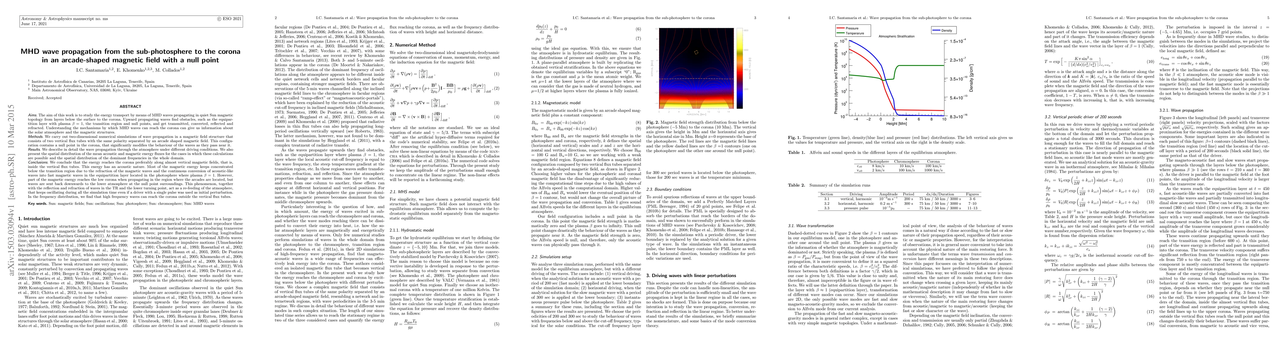 This paper investigates MHD wave propagation in a quiet Sun magnetic field with an arcade-shaped structure and a coronal null point, using 2D numerical simulations. The study finds that energy primarily travels along vertical flux tubes in an acoustic form, while magnetic energy is largely confined below the transition region due to wave conversion and refraction.