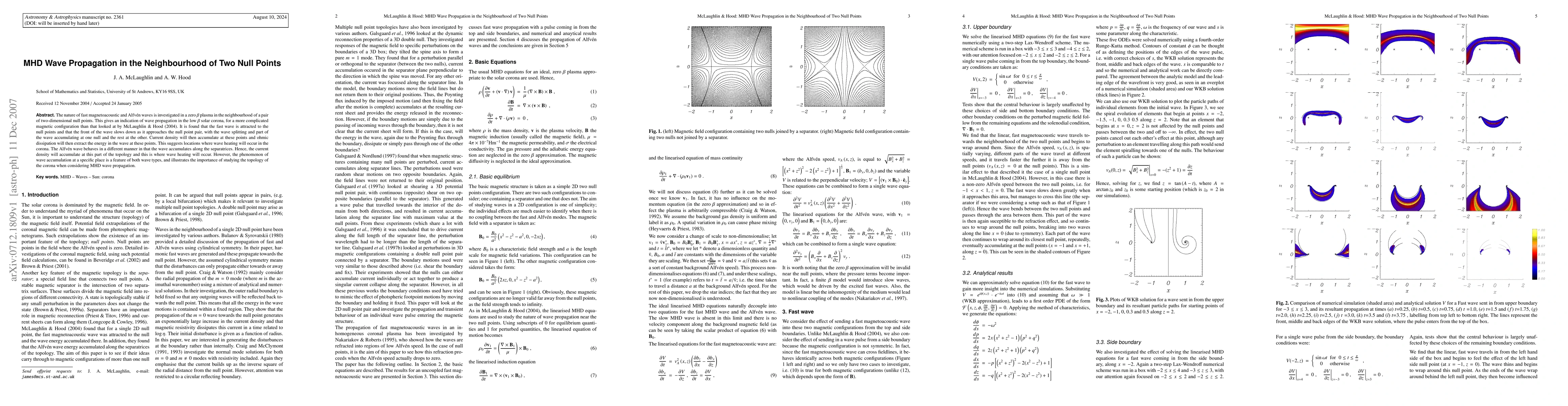 This study investigates the behavior of fast magnetoacoustic and Alfvén waves in a zero-beta plasma near two-dimensional null points, revealing that both wave types accumulate at these points, leading to ohmic dissipation and wave heating in the solar corona. The Alfvén wave specifically accumulates along separatrices, highlighting the significance of magnetic topology in MHD wave propagation.