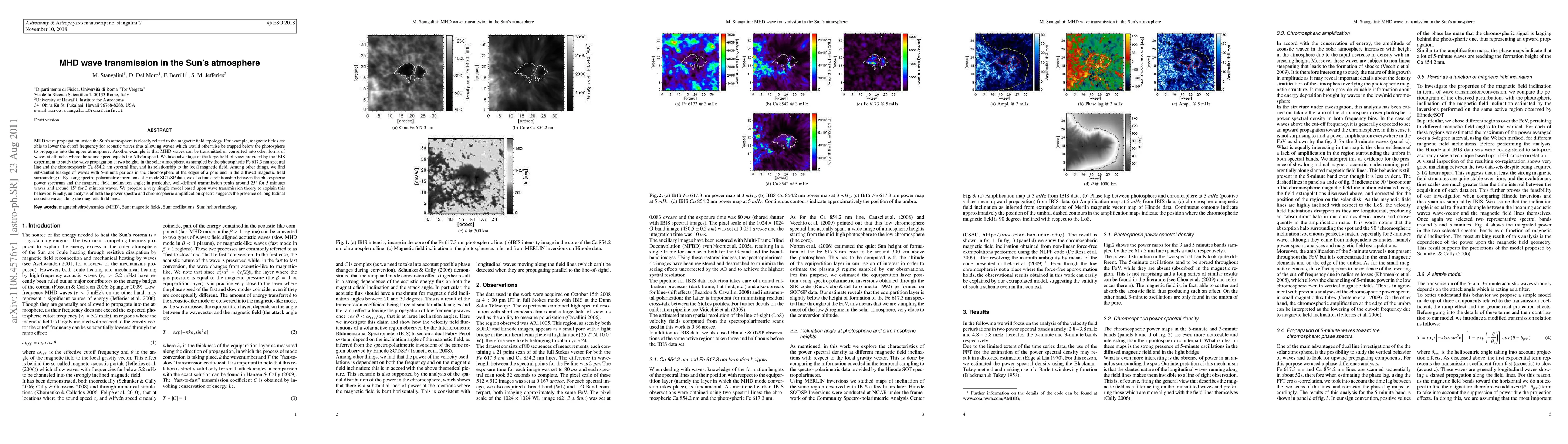 The research investigates magnetohydrodynamic (MHD) wave transmission in the Sun's atmosphere, finding that magnetic fields enable wave propagation into upper layers and convert wave forms. Using data from the IBIS experiment and Hinode SOT/SP, the study reveals wave leakage in chromosphere around sunspots, a correlation between photospheric power spectrum and magnetic field inclination, and suggests longitudinal acoustic waves along magnetic field lines.