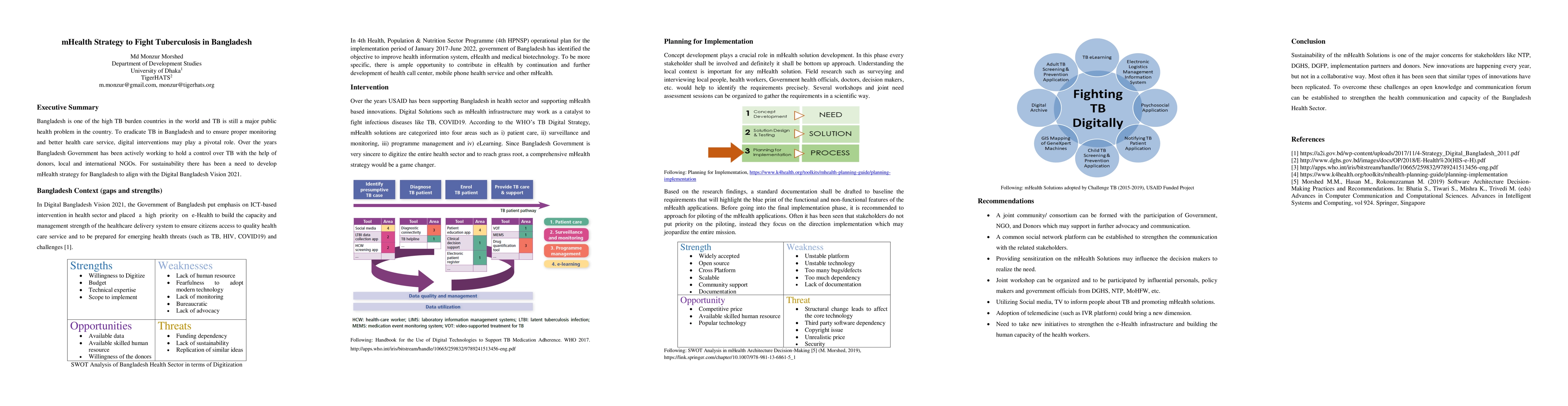 Bangladesh is one of the high TB burden countries in the world and TB is still a major public health problem in the country. To eradicate TB in Bangladesh and to ensure proper monitoring and better health care service, digital interventions may play a pivotal role. Over the years Bangladesh Government has been actively working to hold a control over TB with the help of donors, local and international NGOs. For sustainability there has been a need to develop mHealth strategy for Bangladesh to align with the Digital Bangladesh Vision 2021.