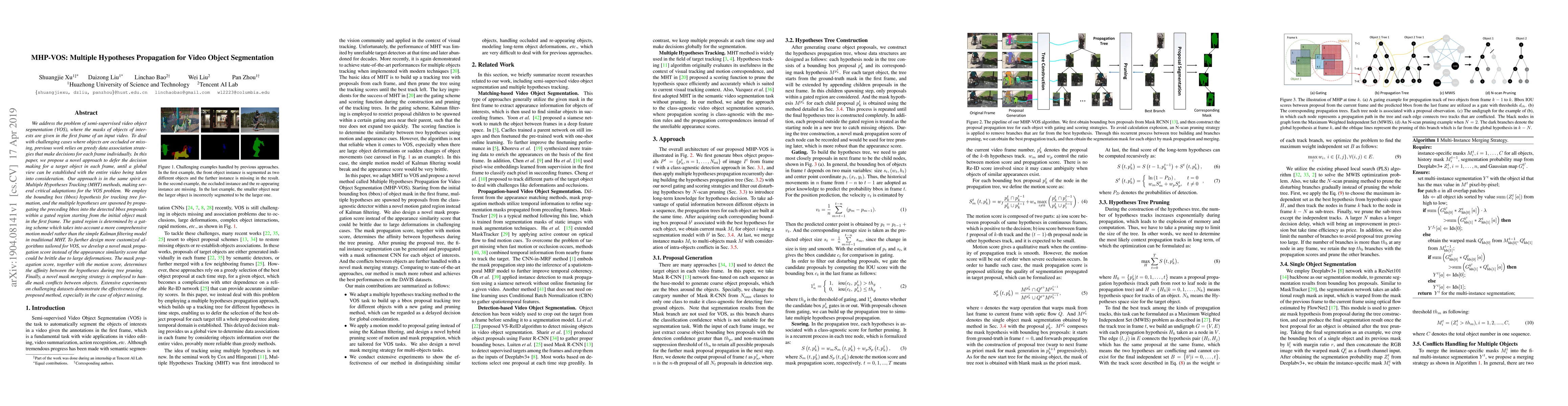We address the problem of semi-supervised video object segmentation (VOS), where the masks of objects of interests are given in the first frame of an input video. To deal with challenging cases where objects are occluded or missing, previous work relies on greedy data association strategies that make decisions for each frame individually. In this paper, we propose a novel approach to defer the decision making for a target object in each frame, until a global view can be established with the entire video being taken into consideration. Our approach is in the same spirit as Multiple Hypotheses Tracking (MHT) methods, making several critical adaptations for the VOS problem. We employ the bounding box (bbox) hypothesis for tracking tree formation, and the multiple hypotheses are spawned by propagating the preceding bbox into the detected bbox proposals within a gated region starting from the initial object mask in the first frame. The gated region is determined by a gating scheme which takes into account a more comprehensive motion model rather than the simple Kalman filtering model in traditional MHT. To further design more customized algorithms tailored for VOS, we develop a novel mask propagation score instead of the appearance similarity score that could be brittle due to large deformations. The mask propagation score, together with the motion score, determines the affinity between the hypotheses during tree pruning. Finally, a novel mask merging strategy is employed to handle mask conflicts between objects. Extensive experiments on challenging datasets demonstrate the effectiveness of the proposed method, especially in the case of object missing.