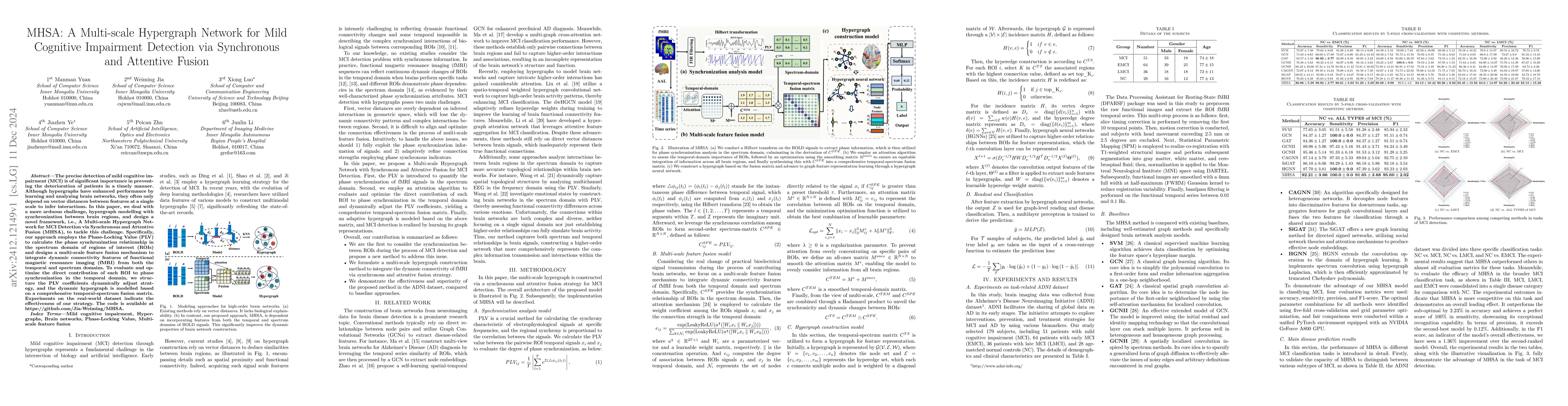 This paper proposes MHSA, a Multi-scale Hypergraph Network for detecting mild cognitive impairment (MCI) by integrating dynamic connectivity features from fMRI. It uses Phase-Locking Value (PLV) to model phase synchronization and employs a multi-scale fusion mechanism to enhance brain network analysis.