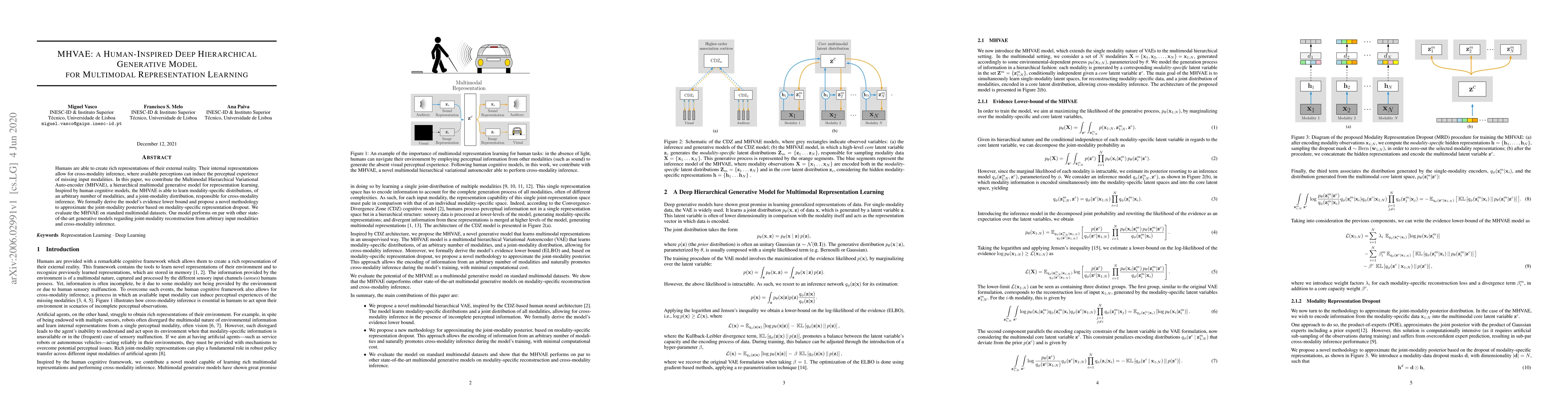 The MHVAE is a hierarchical generative model inspired by human cognition for multimodal representation learning, capable of inferring missing modality inputs through joint-modality distribution. It achieves competitive performance on standard datasets for joint-modality reconstruction and cross-modality inference.