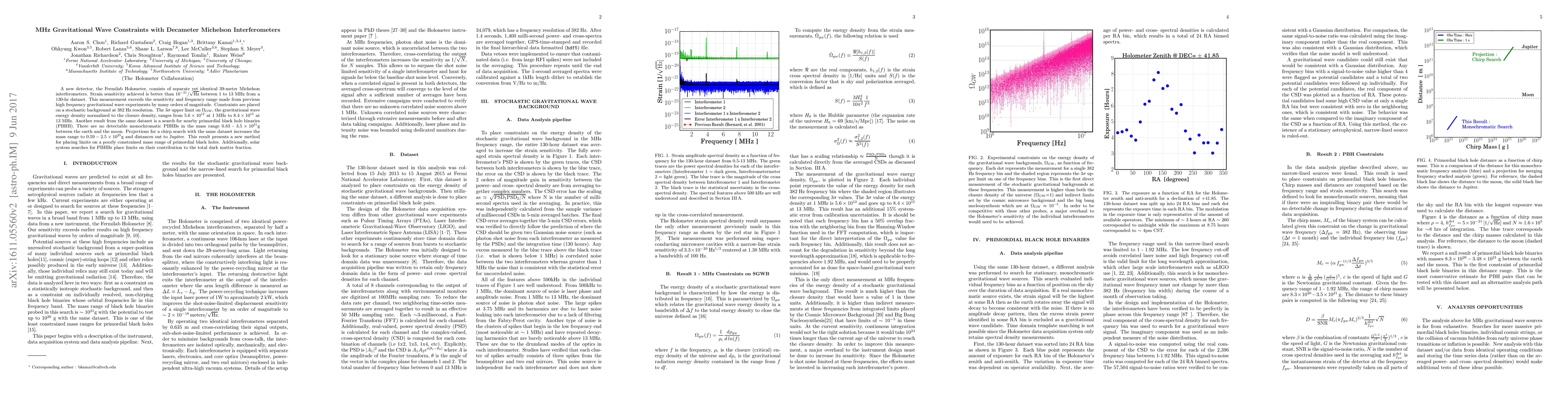 The Fermilab Holometer, a novel decameter Michelson interferometer, achieves unprecedented strain sensitivity better than $10^{-21} /{\sqrt{\rm{Hz}}}$ between 1 to 13 MHz, setting new constraints on gravitational wave backgrounds and primordial black hole binaries. The study finds no detectable monochromatic primordial black holes in a significant mass range, extending limits on their contribution to dark matter.