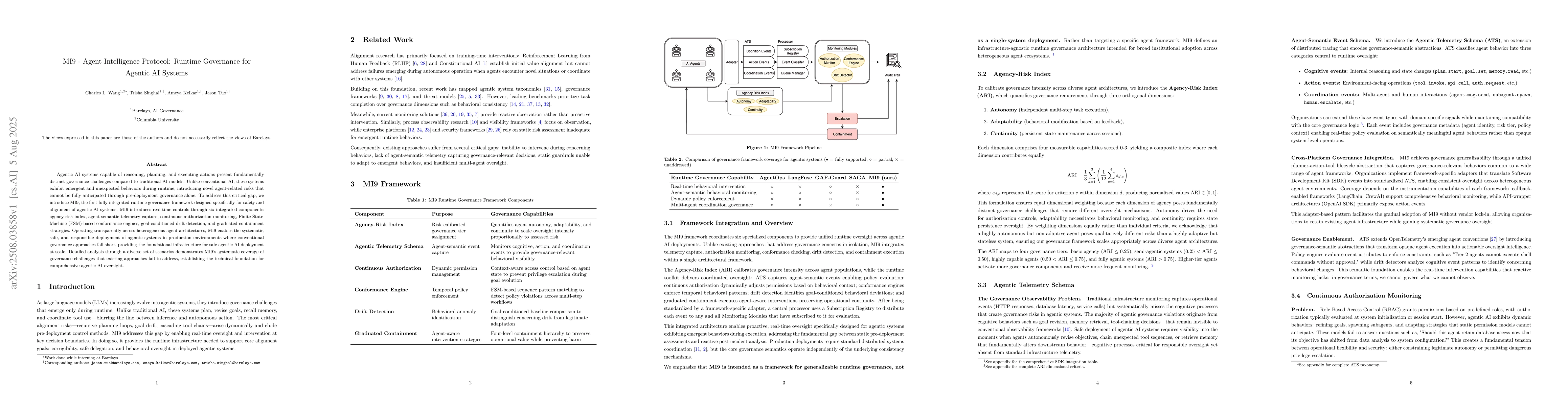 Agentic AI systems capable of reasoning, planning, and executing actions present fundamentally distinct governance challenges compared to traditional AI models. Unlike conventional AI, these systems exhibit emergent and unexpected behaviors during runtime, introducing novel agent-related risks that cannot be fully anticipated through pre-deployment governance alone. To address this critical gap, we introduce MI9, the first fully integrated runtime governance framework designed specifically for safety and alignment of agentic AI systems. MI9 introduces real-time controls through six integrated components: agency-risk index, agent-semantic telemetry capture, continuous authorization monitoring, Finite-State-Machine (FSM)-based conformance engines, goal-conditioned drift detection, and graduated containment strategies. Operating transparently across heterogeneous agent architectures, MI9 enables the systematic, safe, and responsible deployment of agentic systems in production environments where conventional governance approaches fall short, providing the foundational infrastructure for safe agentic AI deployment at scale. Detailed analysis through a diverse set of scenarios demonstrates MI9's systematic coverage of governance challenges that existing approaches fail to address, establishing the technical foundation for comprehensive agentic AI oversight.
