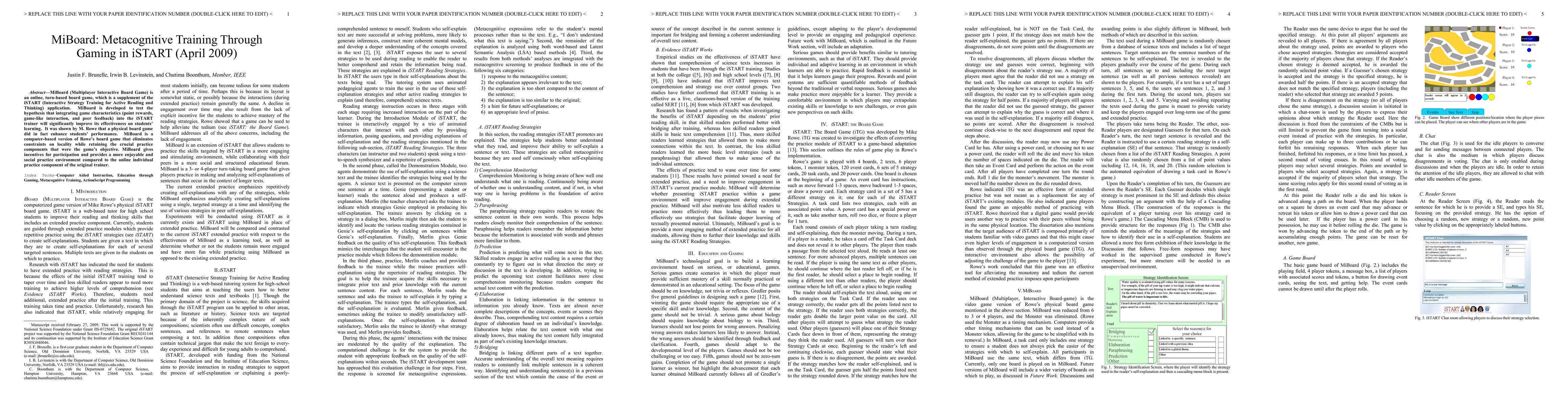 MiBoard is an online multiplayer board game designed to enhance the iSTART application by incorporating game-like elements to improve students' learning. The study hypothesizes that these game features will significantly boost the effectiveness of the training compared to traditional methods.