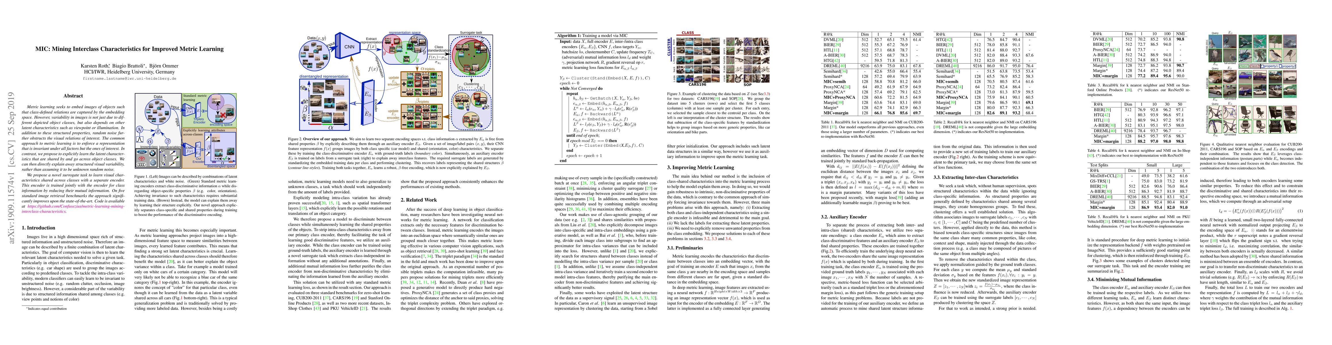 Metric learning seeks to embed images of objects suchthat class-defined relations are captured by the embeddingspace. However, variability in images is not just due to different depicted object classes, but also depends on other latent characteristics such as viewpoint or illumination. In addition to these structured properties, random noise further obstructs the visual relations of interest. The common approach to metric learning is to enforce a representation that is invariant under all factors but the ones of interest. In contrast, we propose to explicitly learn the latent characteristics that are shared by and go across object classes. We can then directly explain away structured visual variability, rather than assuming it to be unknown random noise. We propose a novel surrogate task to learn visual characteristics shared across classes with a separate encoder. This encoder is trained jointly with the encoder for class information by reducing their mutual information. On five standard image retrieval benchmarks the approach significantly improves upon the state-of-the-art.