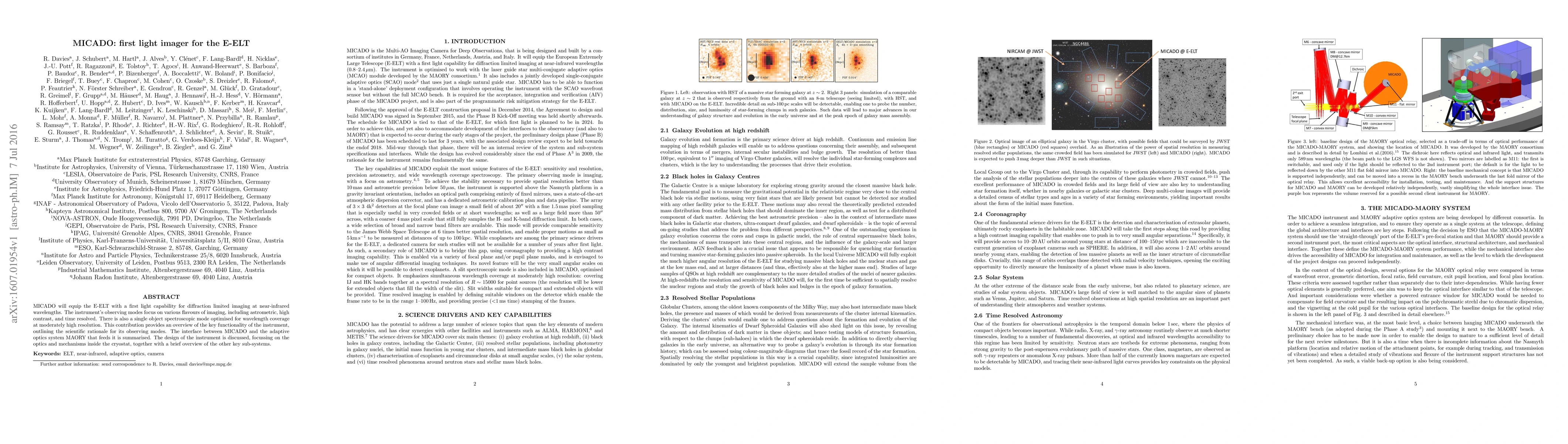 MICADO is a first light imager for the E-ELT, designed for diffraction-limited imaging at near-infrared wavelengths, featuring various imaging modes and a spectroscopic mode. The instrument interfaces with the MAORY adaptive optics system and includes detailed optics and mechanisms within its cryostat.