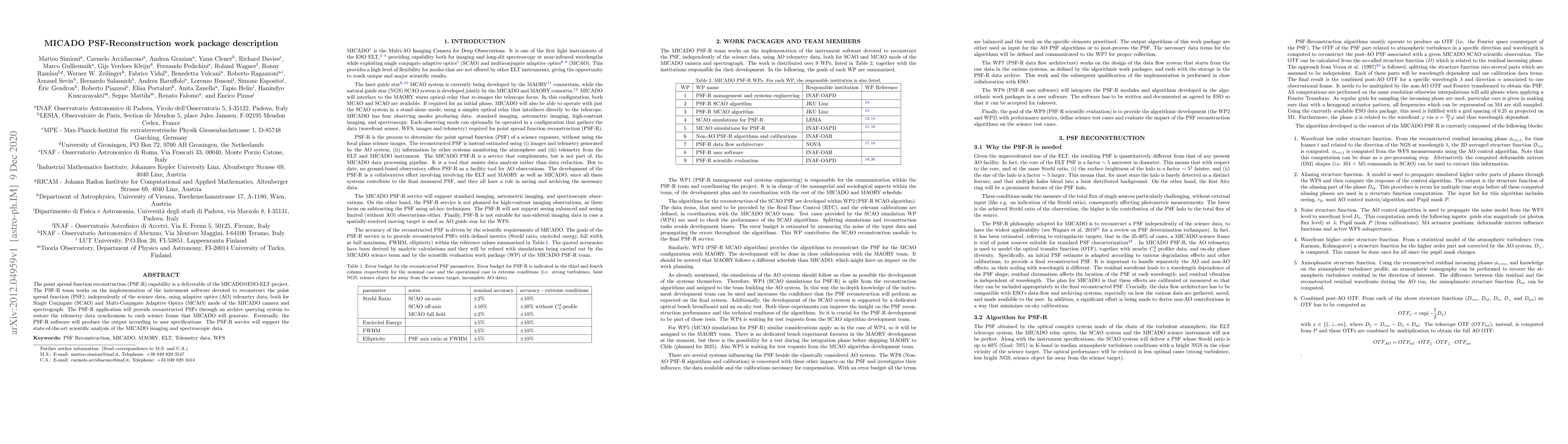 The MICADO PSF-Reconstruction project aims to develop software for reconstructing the point spread function (PSF) independently of science data using adaptive optics telemetry data. This will support advanced scientific analysis of MICADO imaging and spectroscopic data from both Single Conjugate and Multi-Conjugate Adaptive Optics modes.