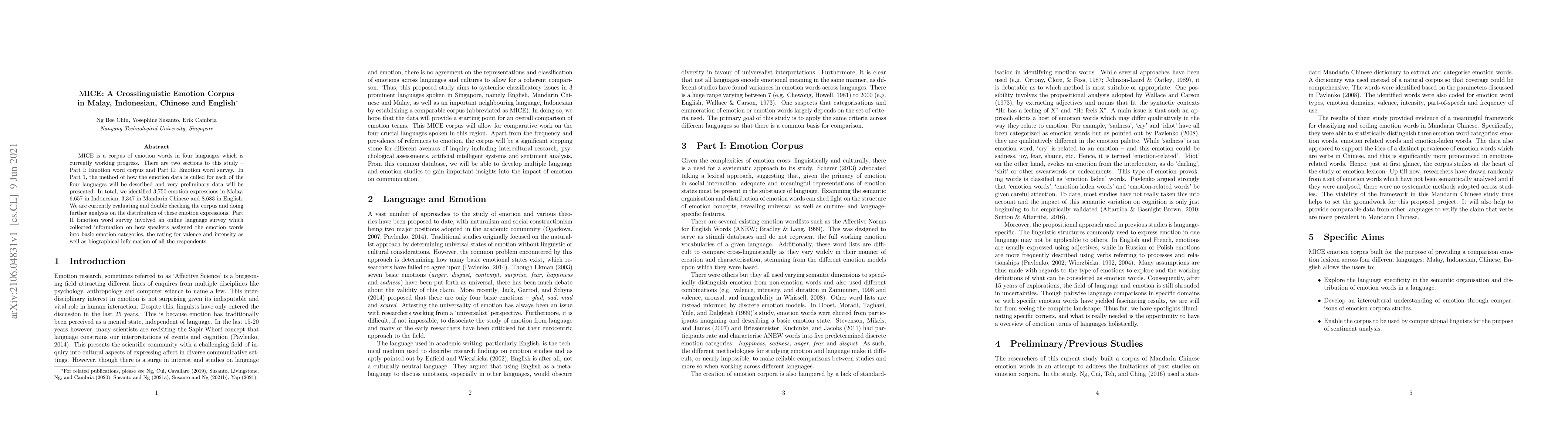 MICE is a corpus of emotion words in Malay, Indonesian, Chinese, and English, currently under development. It includes a preliminary collection of 3,750 emotion expressions in Malay, 6,657 in Indonesian, 3,347 in Mandarin Chinese, and 8,683 in English, with ongoing evaluation and analysis. Part II involves an online survey assessing how speakers categorize and rate these emotions.