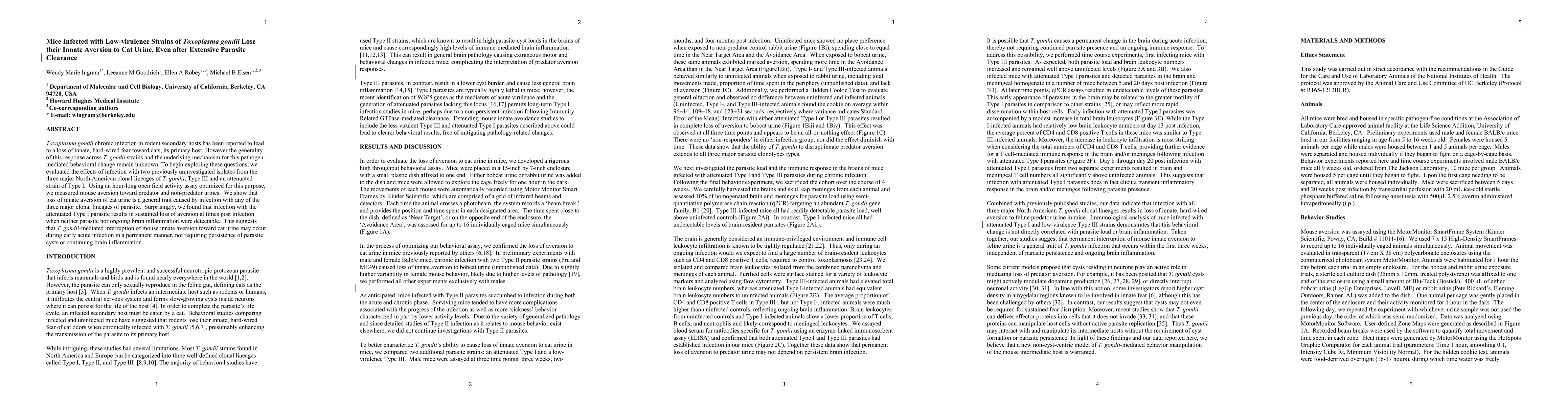 Toxoplasma gondii chronic infection in rodent secondary hosts has been reported to lead to a loss of innate, hard-wired fear toward cats, its primary host. However the generality of this response across T. gondii strains and the underlying mechanism for this pathogen mediated behavioral change remain unknown. To begin exploring these questions, we evaluated the effects of infection with two previously uninvestigated isolates from the three major North American clonal lineages of T. gondii, Type III and an attenuated strain of Type I. Using an hour-long open field activity assay optimized for this purpose, we measured mouse aversion toward predator and non-predator urines. We show that loss of innate aversion of cat urine is a general trait caused by infection with any of the three major clonal lineages of parasite. Surprisingly, we found that infection with the attenuated Type I parasite results in sustained loss of aversion at times post infection when neither parasite nor ongoing brain inflammation were detectable. This suggests that T. gondii-mediated interruption of mouse innate aversion toward cat urine may occur during early acute infection in a permanent manner, not requiring persistence of parasitecysts or continuing brain inflammation.