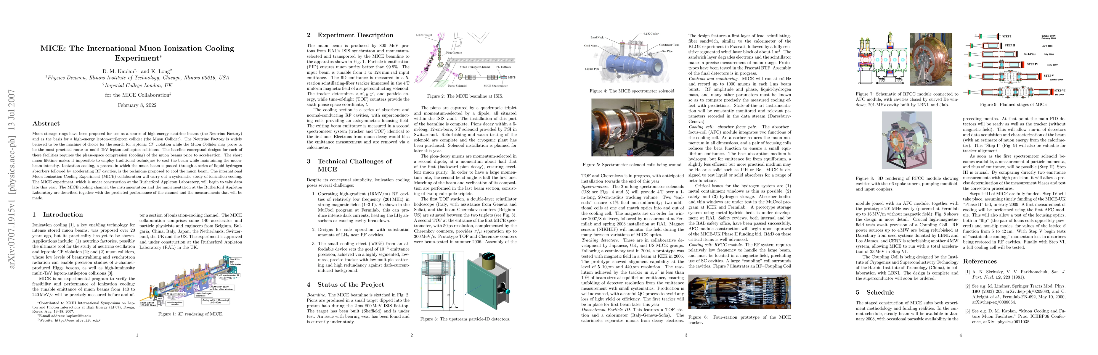 The MICE experiment aims to study ionization cooling to compress muon beams for potential Neutrino Factory and Muon Collider applications. The experiment, under construction at the Rutherford Appleton Laboratory, will test the cooling technique using liquid-hydrogen absorbers and RF cavities.