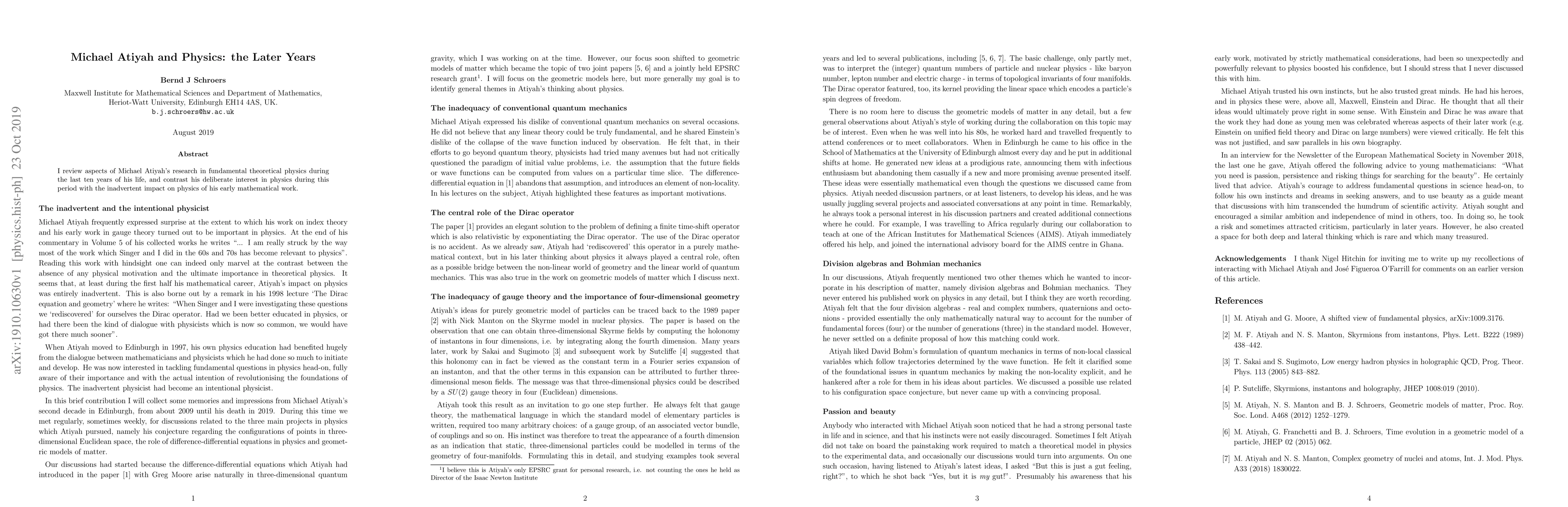 I review aspects of Michael Atiyah's research in fundamental theoretical physics during the last ten years of his life, and contrast his deliberate interest in physics during this period with the inadvertent impact on physics of his early mathematical work.