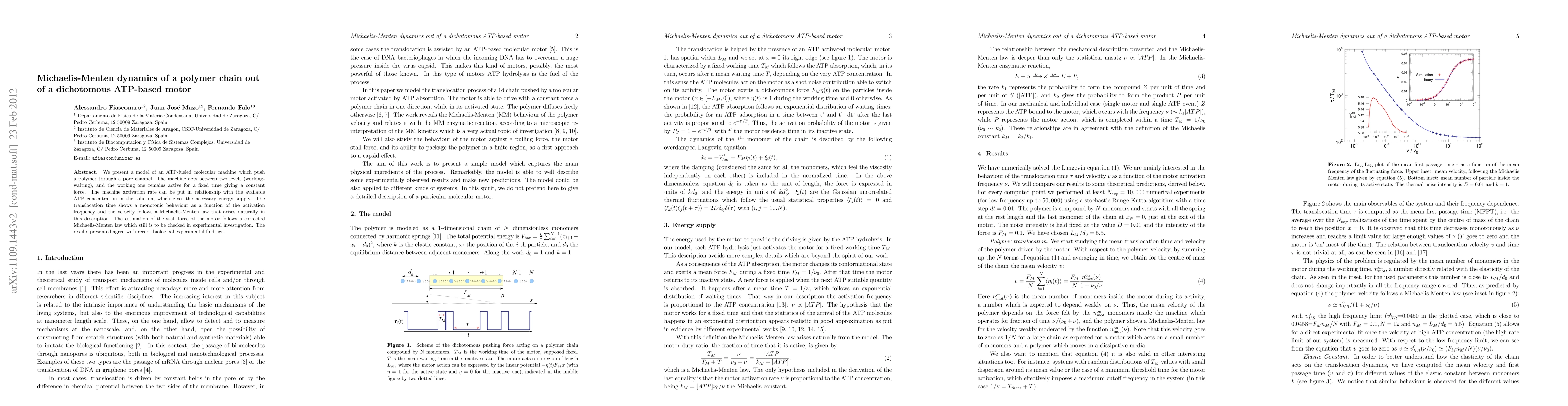 The paper introduces a Michaelis-Menten-based description of an ATP-driven molecular motor's velocity and stall force, providing analytical expressions for these quantities as functions of ATP concentration and motor activation frequency.