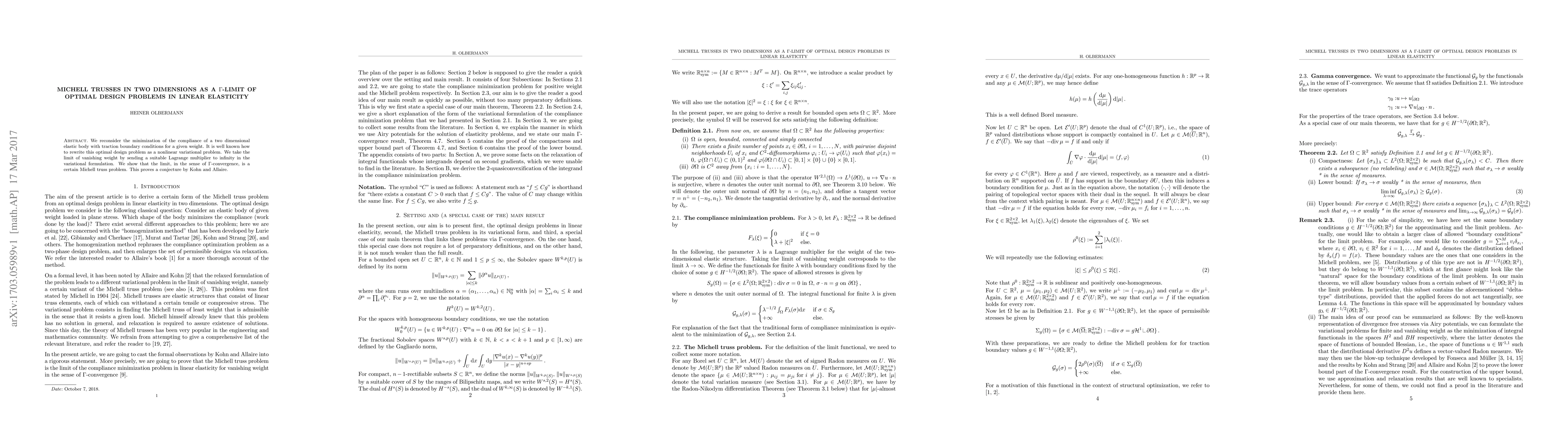 We reconsider the minimization of the compliance of a two dimensional elastic body with traction boundary conditions for a given weight. It is well known how to rewrite this optimal design problem as a nonlinear variational problem. We take the limit of vanishing weight by sending a suitable Lagrange multiplier to infinity in the variational formulation. We show that the limit, in the sense of $\Gamma$-convergence, is a certain Michell truss problem. This proves a conjecture by Kohn and Allaire.