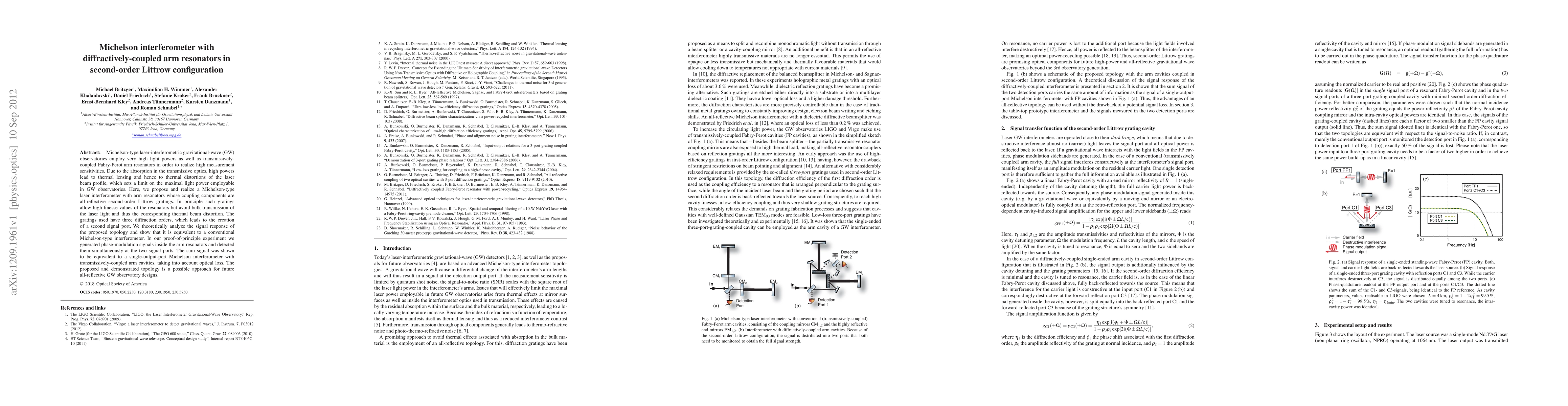 This paper proposes a Michelson interferometer using diffractively-coupled arm resonators with all-reflective second-order Littrow gratings to avoid thermal lensing issues caused by high light powers in gravitational-wave observatories. The experimental setup demonstrates equivalent signal response to a conventional interferometer, suggesting potential for future all-reflective designs.