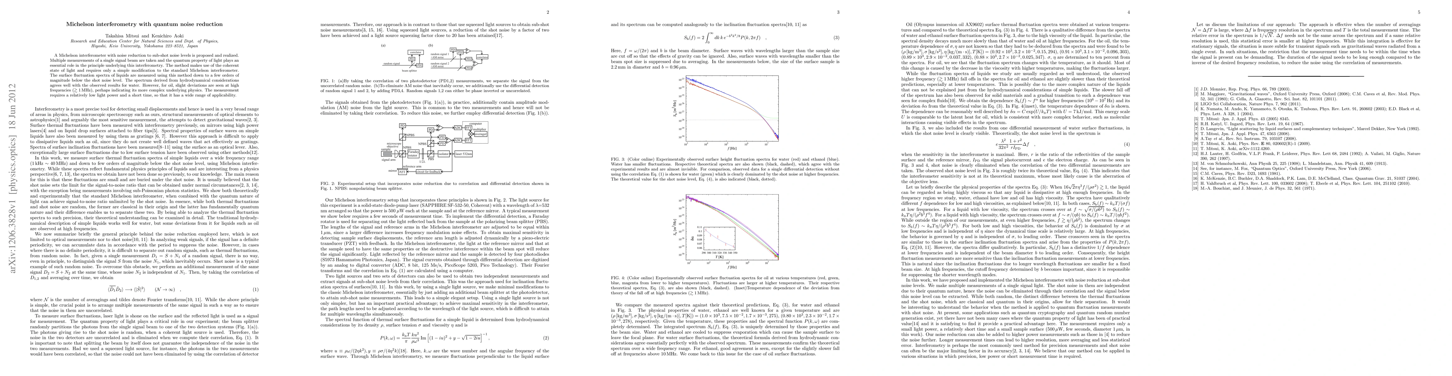 This paper proposes and demonstrates a Michelson interferometer that achieves sub-shot noise levels through quantum noise reduction, utilizing the coherent state of light. The method shows significant accuracy in measuring surface fluctuation spectra of liquids, particularly water, but reveals deviations in oil at high frequencies.