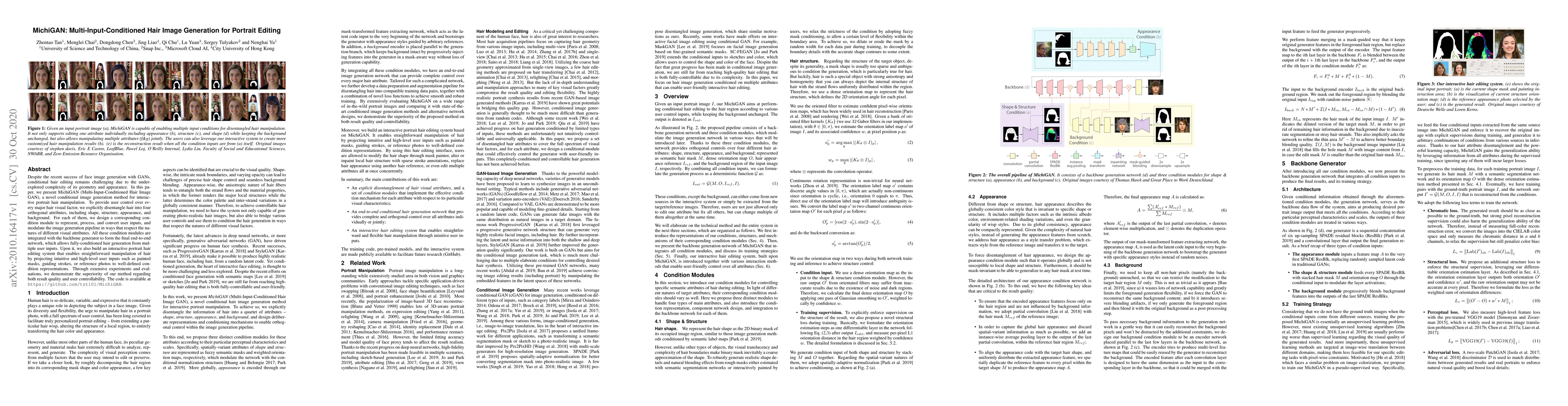 MichiGAN is a novel GAN-based method for conditional hair image generation, disentangling hair into shape, structure, appearance, and background attributes for precise editing. It integrates multiple condition modules to respect different visual aspects, enabling interactive portrait hair manipulation through intuitive user inputs.