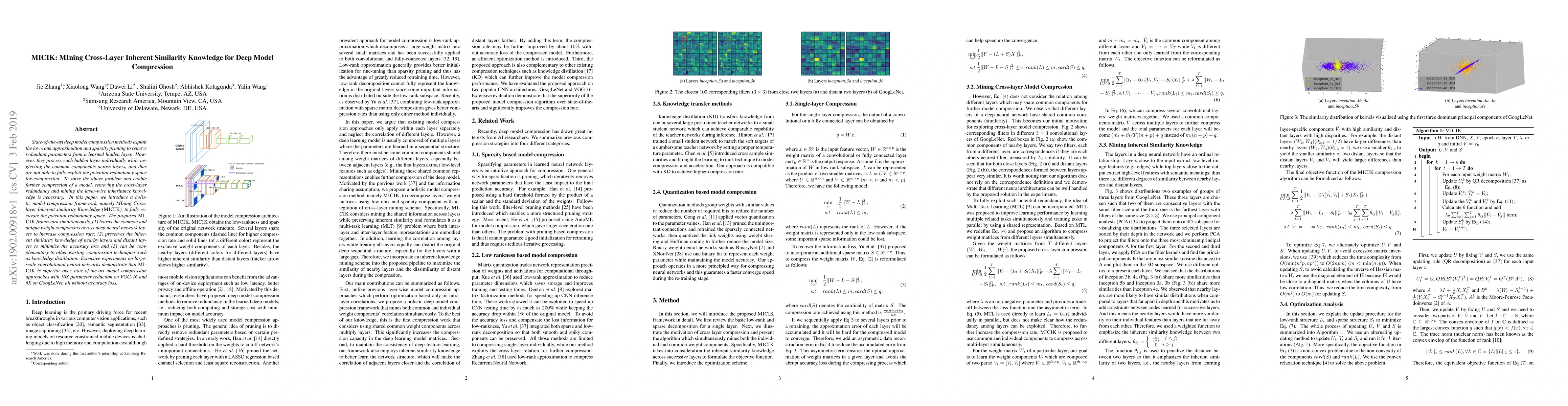 State-of-the-art deep model compression methods exploit the low-rank approximation and sparsity pruning to remove redundant parameters from a learned hidden layer. However, they process each hidden layer individually while neglecting the common components across layers, and thus are not able to fully exploit the potential redundancy space for compression. To solve the above problem and enable further compression of a model, removing the cross-layer redundancy and mining the layer-wise inheritance knowledge is necessary. In this paper, we introduce a holistic model compression framework, namely MIning Cross-layer Inherent similarity Knowledge (MICIK), to fully excavate the potential redundancy space. The proposed MICIK framework simultaneously, (1) learns the common and unique weight components across deep neural network layers to increase compression rate; (2) preserves the inherent similarity knowledge of nearby layers and distant layers to minimize the accuracy loss and (3) can be complementary to other existing compression techniques such as knowledge distillation. Extensive experiments on large-scale convolutional neural networks demonstrate that MICIK is superior over state-of-the-art model compression approaches with 16X parameter reduction on VGG-16 and 6X on GoogLeNet, all without accuracy loss.