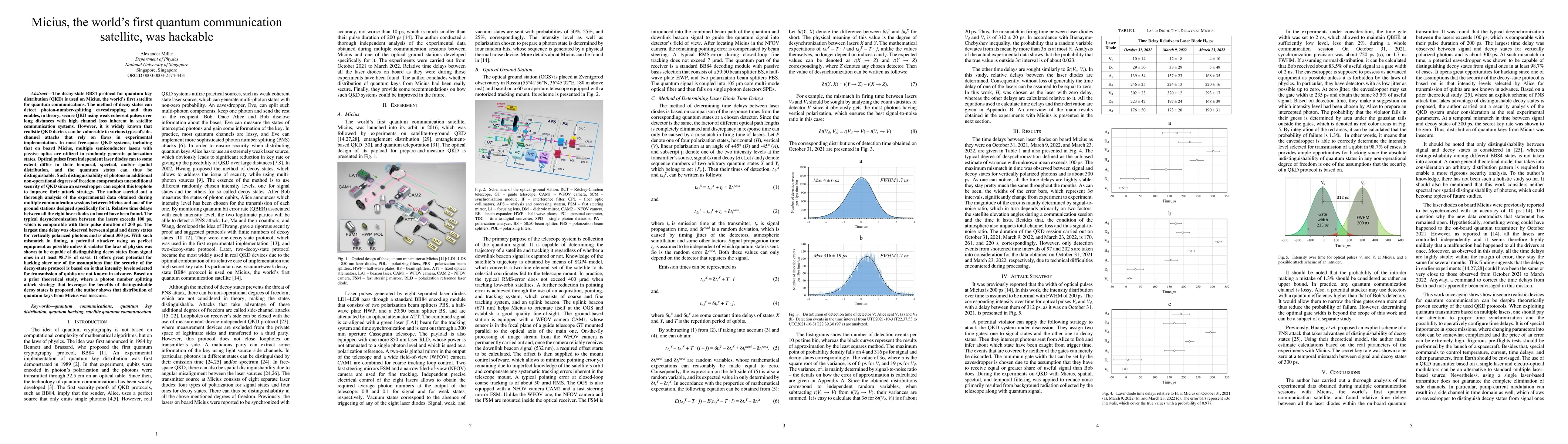 The Micius quantum communication satellite was found to be hackable due to desynchronization between its laser diodes, compromising the security of quantum key distribution protocols like BB84. This finding highlights the vulnerabilities of long-distance space-based QKD systems.
