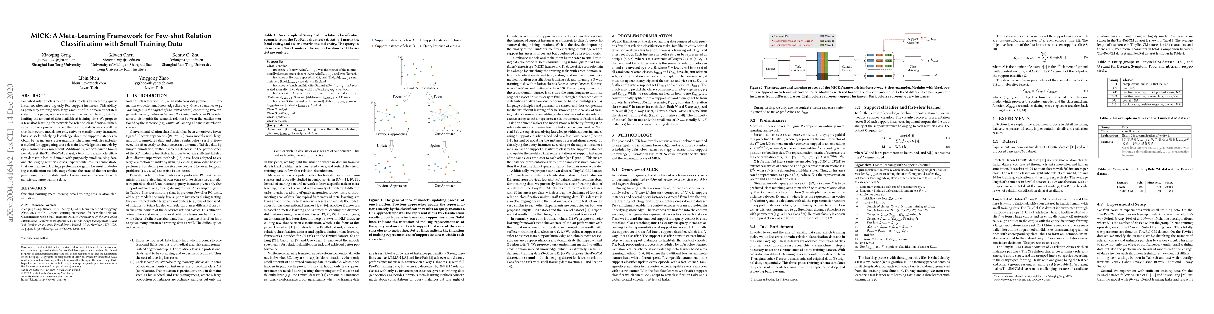 This paper introduces MICK, a meta-learning framework for few-shot relation classification with minimal training data, which leverages cross-domain knowledge and constructs a new TinyRel-CM dataset. Experimental results show that MICK outperforms existing methods under data scarcity and performs competitively with larger datasets.
