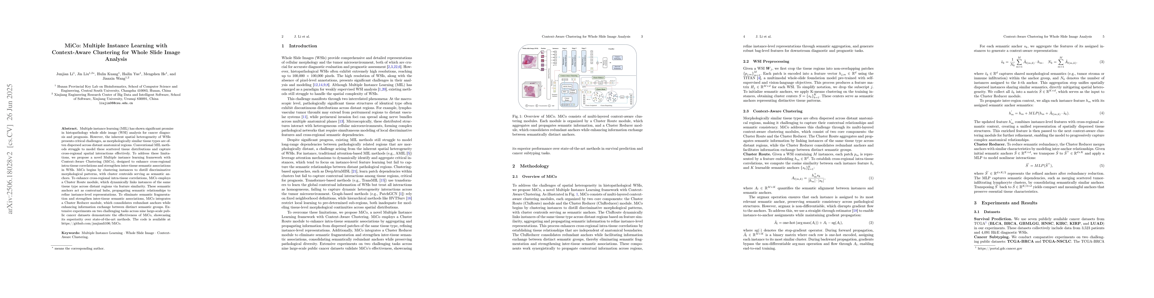 Multiple instance learning (MIL) has shown significant promise in histopathology whole slide image (WSI) analysis for cancer diagnosis and prognosis. However, the inherent spatial heterogeneity of WSIs presents critical challenges, as morphologically similar tissue types are often dispersed across distant anatomical regions. Conventional MIL methods struggle to model these scattered tissue distributions and capture cross-regional spatial interactions effectively. To address these limitations, we propose a novel Multiple instance learning framework with Context-Aware Clustering (MiCo), designed to enhance cross-regional intra-tissue correlations and strengthen inter-tissue semantic associations in WSIs. MiCo begins by clustering instances to distill discriminative morphological patterns, with cluster centroids serving as semantic anchors. To enhance cross-regional intra-tissue correlations, MiCo employs a Cluster Route module, which dynamically links instances of the same tissue type across distant regions via feature similarity. These semantic anchors act as contextual hubs, propagating semantic relationships to refine instance-level representations. To eliminate semantic fragmentation and strengthen inter-tissue semantic associations, MiCo integrates a Cluster Reducer module, which consolidates redundant anchors while enhancing information exchange between distinct semantic groups. Extensive experiments on two challenging tasks across nine large-scale public cancer datasets demonstrate the effectiveness of MiCo, showcasing its superiority over state-of-the-art methods. The code is available at https://github.com/junjianli106/MiCo.