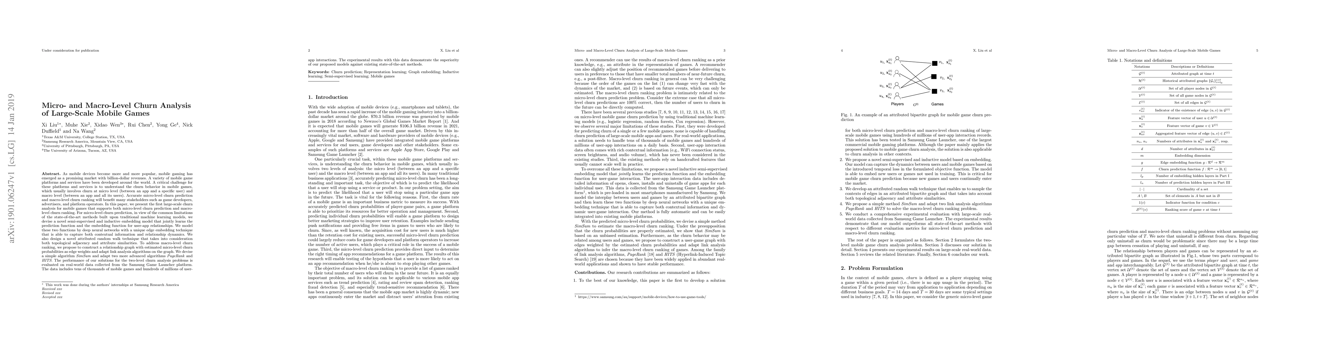 This paper presents a comprehensive analysis of churn behavior in large-scale mobile games, introducing a novel semi-supervised model for micro-level churn prediction and advanced algorithms for macro-level churn ranking. The proposed methods are evaluated on data from the Samsung Game Launcher platform.