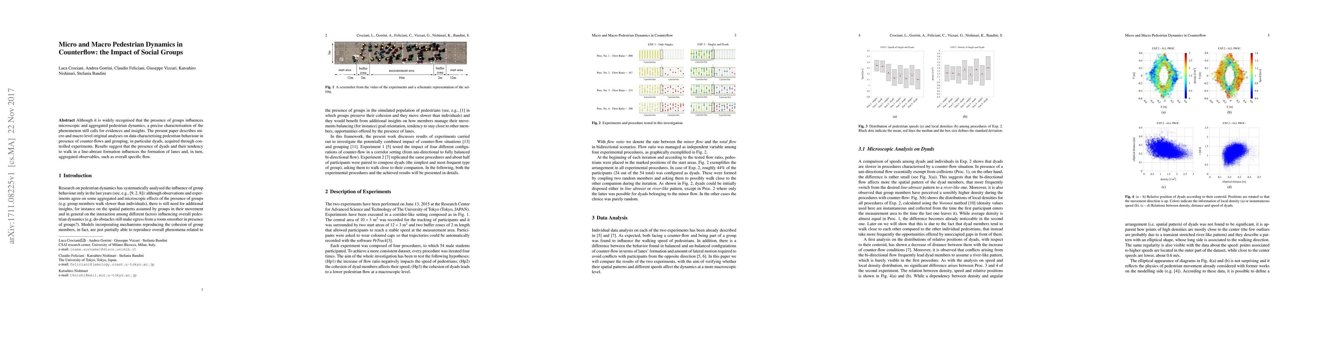 Although it is widely recognised that the presence of groups influences microscopic and aggregated pedestrian dynamics, a precise characterisation of the phenomenon still calls for evidences and insights. The present paper describes micro and macro level original analyses on data characterising pedestrian behaviour in presence of counter-flows and grouping, in particular dyads, acquired through controlled experiments. Results suggest that the presence of dyads and their tendency to walk in a line-abreast formation influences the formation of lanes and, in turn, aggregated observables, such as overall specific flow.