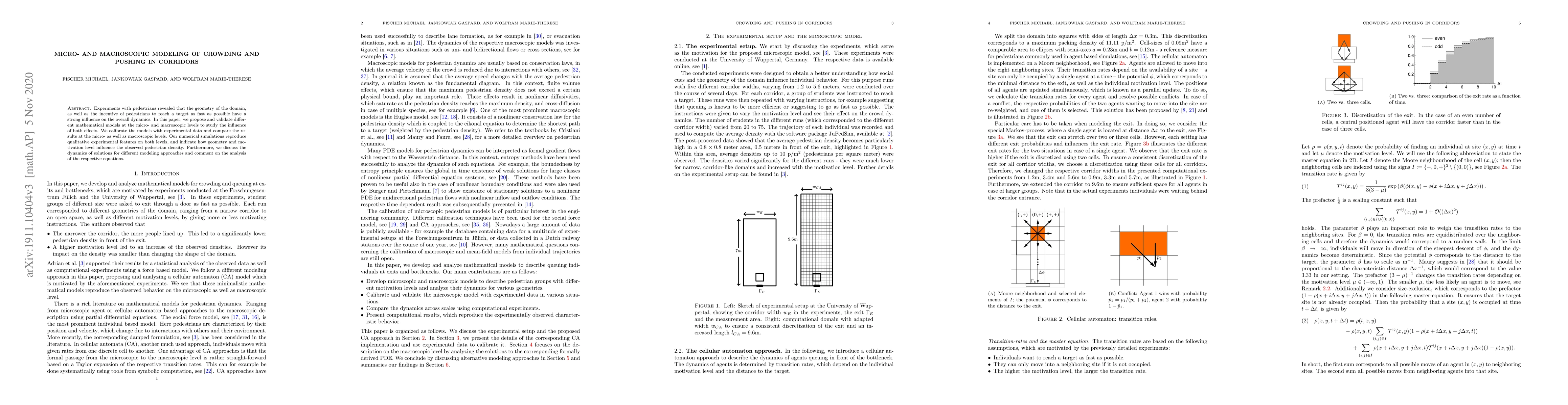 Experiments with pedestrians revealed that the geometry of the domain, as well as the incentive of pedestrians to reach a target as fast as possible have a strong influence on the overall dynamics. In this paper, we propose and validate different mathematical models at the micro- and macroscopic levels to study the influence of both effects. We calibrate the models with experimental data and compare the results at the micro -- as well as macroscopic levels. Our numerical simulations reproduce qualitative experimental features on both levels, and indicate how geometry and motivation level influence the observed pedestrian density. Furthermore, we discuss the dynamics of solutions for different modeling approaches and comment on the analysis of the respective equations.