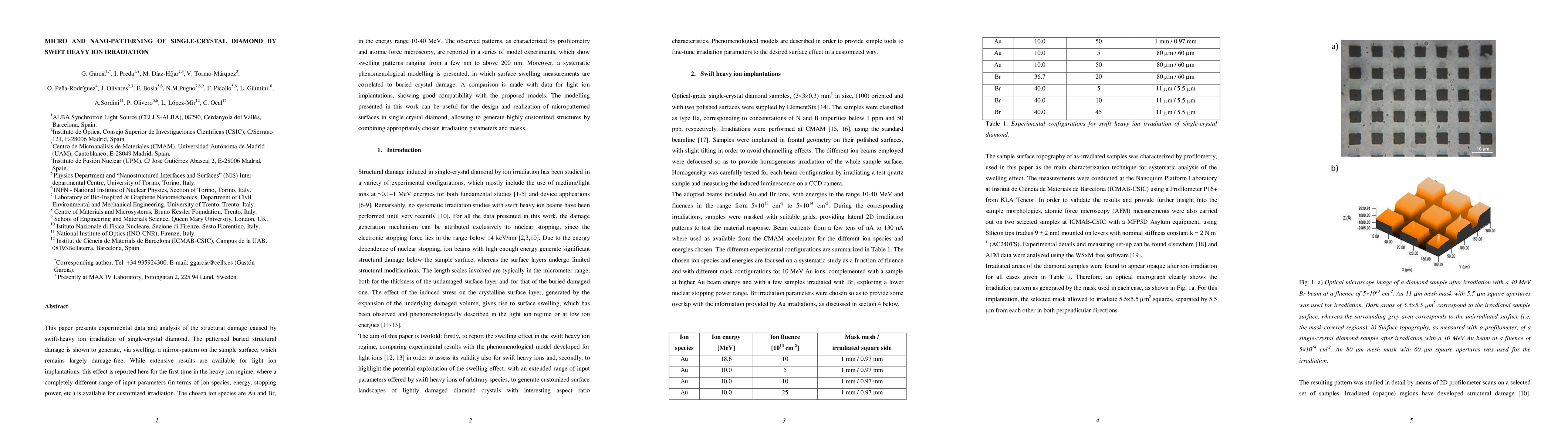 This paper investigates the structural damage in single-crystal diamond caused by swift heavy ion irradiation, revealing a novel mirror-pattern formation via swelling, and presents a phenomenological model correlating surface swelling to buried damage, useful for designing micropatterned diamond surfaces.