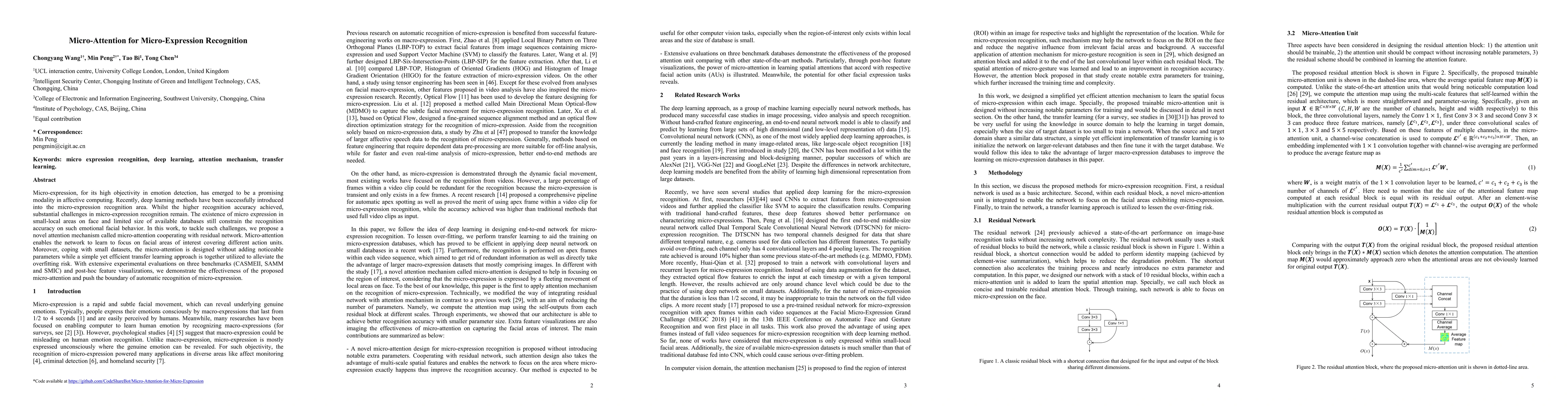 Micro-expression, for its high objectivity in emotion detection, has emerged to be a promising modality in affective computing. Recently, deep learning methods have been successfully introduced into the micro-expression recognition area. Whilst the higher recognition accuracy achieved, substantial challenges in micro-expression recognition remain. The existence of micro expression in small-local areas on face and limited size of available databases still constrain the recognition accuracy on such emotional facial behavior. In this work, to tackle such challenges, we propose a novel attention mechanism called micro-attention cooperating with residual network. Micro-attention enables the network to learn to focus on facial areas of interest covering different action units. Moreover, coping with small datasets, the micro-attention is designed without adding noticeable parameters while a simple yet efficient transfer learning approach is together utilized to alleviate the overfitting risk. With extensive experimental evaluations on three benchmarks (CASMEII, SAMM and SMIC) and post-hoc feature visualizations, we demonstrate the effectiveness of the proposed micro-attention and push the boundary of automatic recognition of micro-expression.