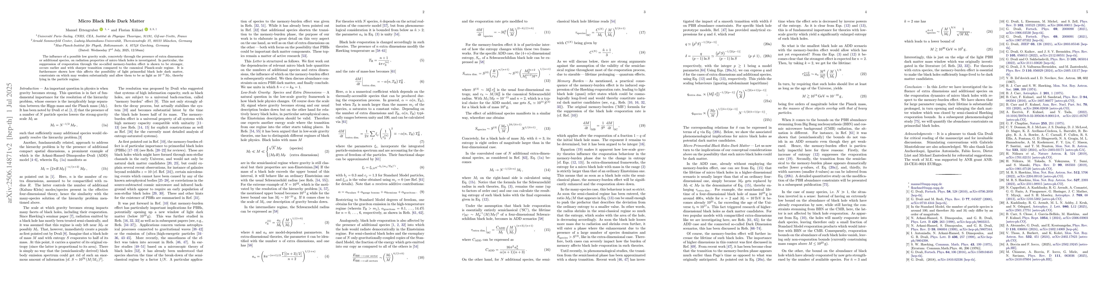 The influence of a possible low gravity scale, concretely through the presence of extra dimensions or additional species, on radiation properties of micro black holes is investigated. In particular, the suppression of evaporation through the so-called memory-burden effect is shown to be stronger, occurs earlier and with sharper transition compared to the canonical Planck-scale regime. It is furthermore shown how this affects the possibility of light primordial black hole dark matter, constraints on which may weaken substantially and allow them to be as light as $10^{-5}\,M_{\rm P}$, thereby lying in the particle regime.